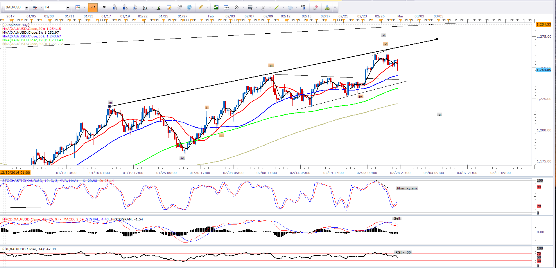 Trên đồ thị ngày, chúng ta thấy giá vàng chạm mức MA200 ngày tại 1264, cao hơn so với mức 1255.97 của cuối tuần trước, và cũng chỉ còn cách 6 USD so với mục tiêu giá ban đầu. Tuy nhiên, giá vàng giảm trở lại sau khi chạm vào MA200,. Chúng ta có đủ cấu trúc sóng Elliott cho sóng tăng (i) từ i đến v. Khả năng sóng (i) kết thúc với sự phân kỳ âm tam đoạn giữa giá và chỉ báo MACD Histogram. Phân kỳ âm giữa giá và Stochastic Oscillator. Chỉ báo RSI đã cắt xuống dưới 70. Điều này cho thấy, có lẽ giá vàng không kịp cham vào mức 1,270 như kỳ vọng ban đầu. Trong phân tích kỹ thuật, các mục tiêu giá có thể chỉ gần đạt tới. Mức 1264, cũng là cạnh trên của một mẫu hình chiếc nêm (Wedge) có khả năng diễn ra.