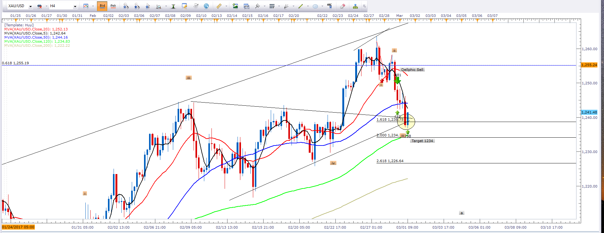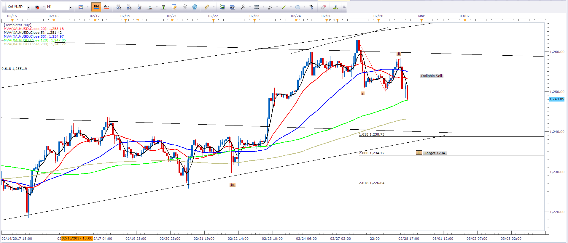 Đồ thị khung thời gian H1 giúp cho chúng ta có điểm bán tốt. Mẫu hình Dellphic Sell xuất hiện. Giá đã phá đáy ngày hôm 27.2.2017 có thể dẫn tới xuất hiện sóng iii (màu vàng). Bán theo điểm phá hướng xuống được thực hiện.