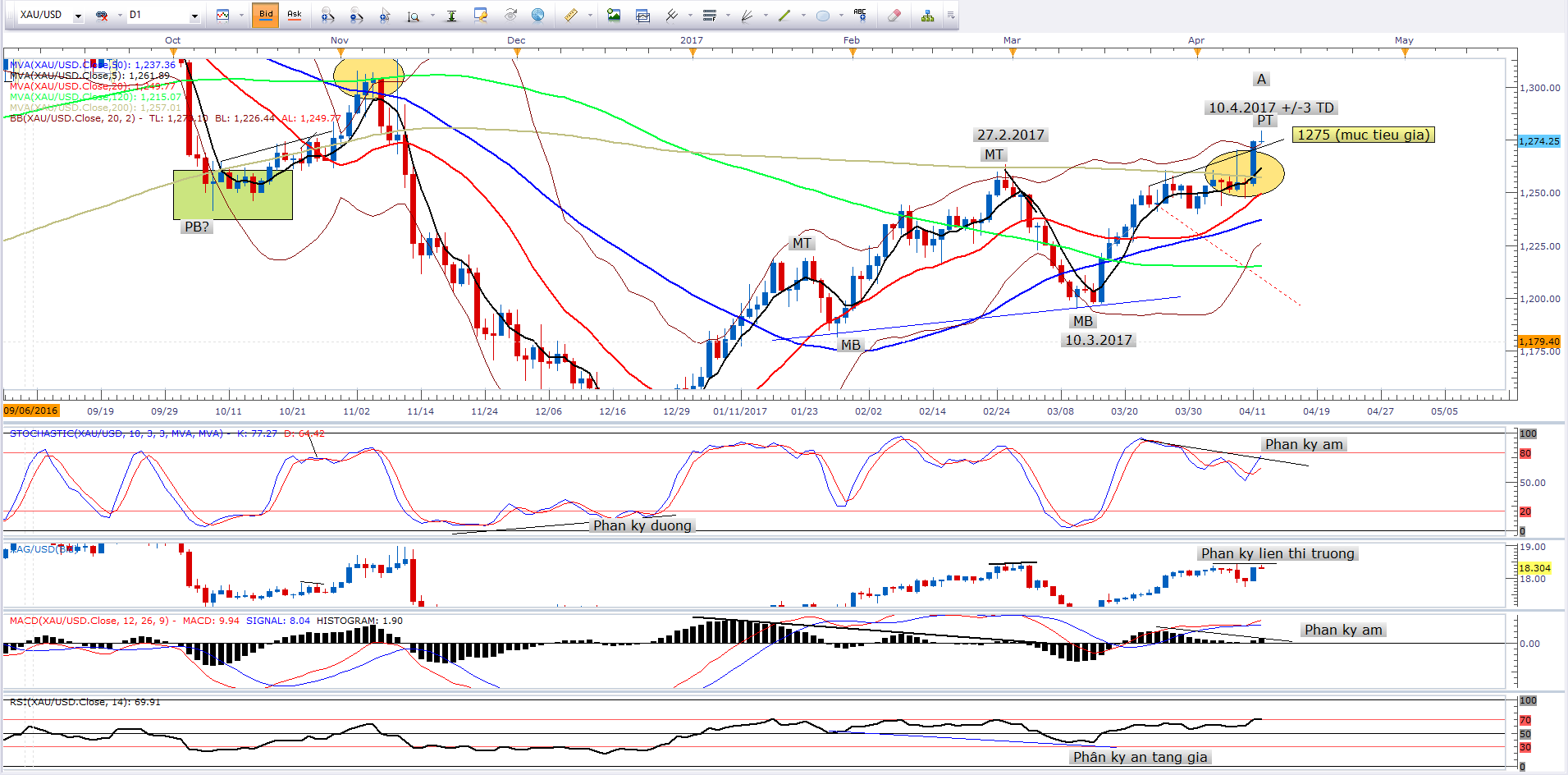 Dựa trên việc phân tích chu kỳ cho giá vàng, rất có nhiều khả năng giá vàng sẽ hình thành đỉnh PT (Primary Top- Đỉnh chu kỳ sơ cấp) vào ngày 10.4.2017 +/-3 ngày giao dịch.
