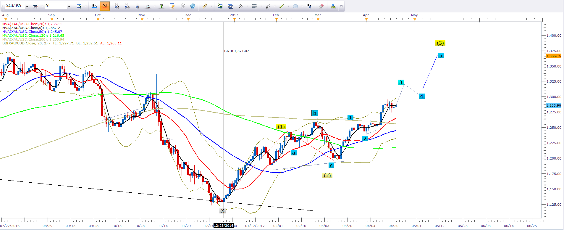 Tôi đang thay đổi mô hình cấu trúc sóng Elliott cho vàng. Theo đó, khả năng giá vàng đang diễn ra sóng (3) màu vàng. Lý do tôi thay đổi quan điểm là MA5 ngày đang nằm trên MA20 ngày và đường MA20 ngày đang dốc lên. Giá chạm vào MA20 ngày là bật lên, không thủng. Trật tự các đường MA đang thể hiện choxu hướng tăng với MA5 ngày>MA20 ngày>MA50 ngày >MA120 ngày. Giá cũng đã phá vỡ đường MA200 ngày. Tất cả những dấu hiệu này đủ để tôi đề nghị nên thực hiện chiến lược giao dịch theo sau xu hướng tăng. Mục tiêu giá của sóng (3) có thể là vùng 1,375-1,380 USD/oz.