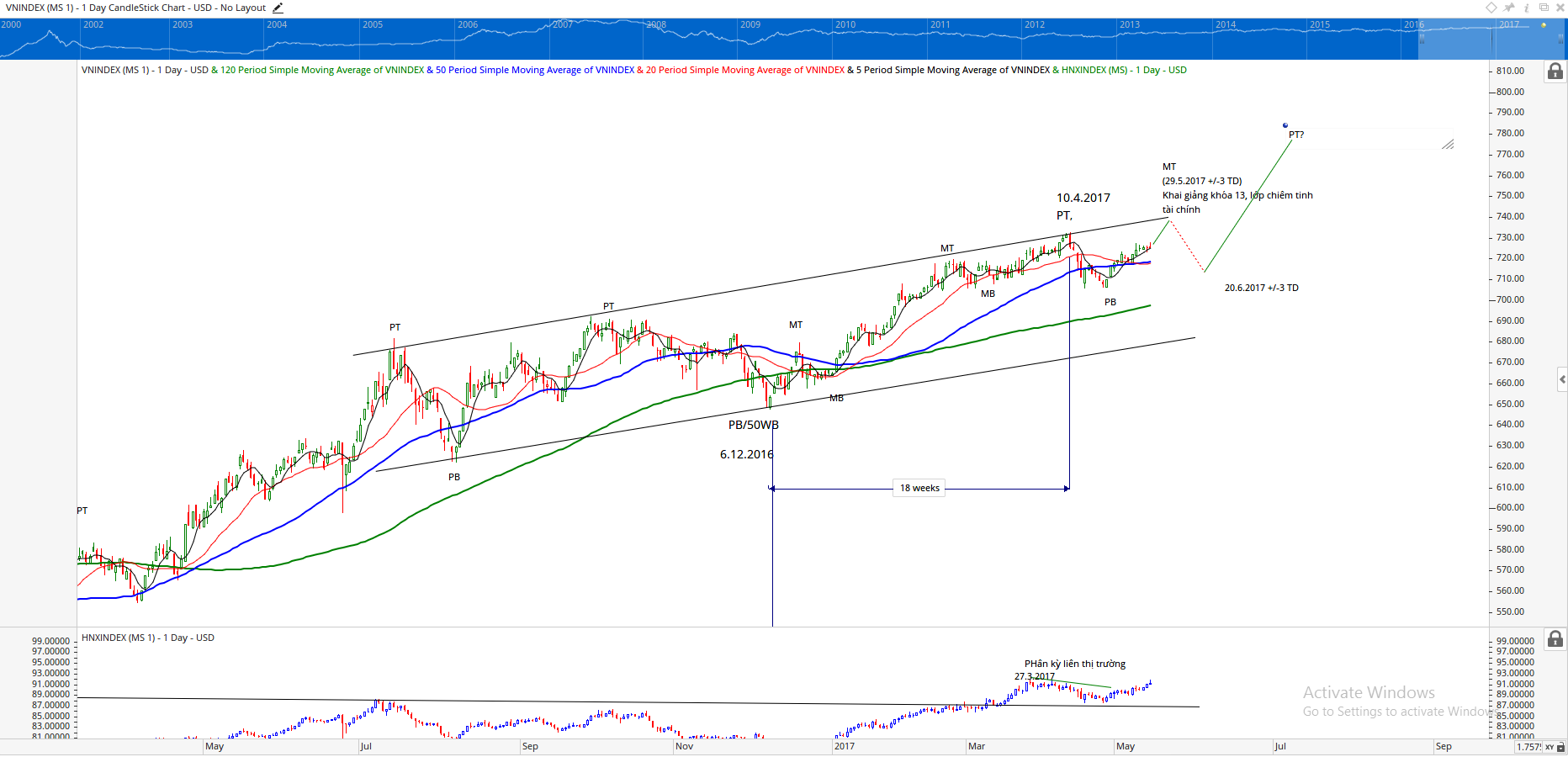 Dự báo của tôi về kịch bản đáy PB rơi vào 24.5.2017 +/-3 ngày giao dịch trước đây có thể không chính xác. Hiện tại, tôi thay đổi kịch bản thành đáy PB đã rơi vào ngày 24.4.2017. Ở trong trường hợp này, tôi kỳ vọng thị trường vẫn còn tăng giá cho đến ít nhất điểm đảo chiều chiêm tinh 29.5.2017 +/-3 ngày giao dịch. Các cấu trúc sóng Elliott có nhiều kịch bản phức tạp. Tôi đồng ý sử dụng chiến lược theo sau xu hướng tăng cho đến ngày đảo chiều chiêm tinh. Lúc này, ngày đảo chiều chiêm tinh 29.5.2017 được kỳ vọng là đảo chiều đỉnh (có thể là đỉnh MT) chứ không phải đảo chiều đáy như dự báo trước đây.