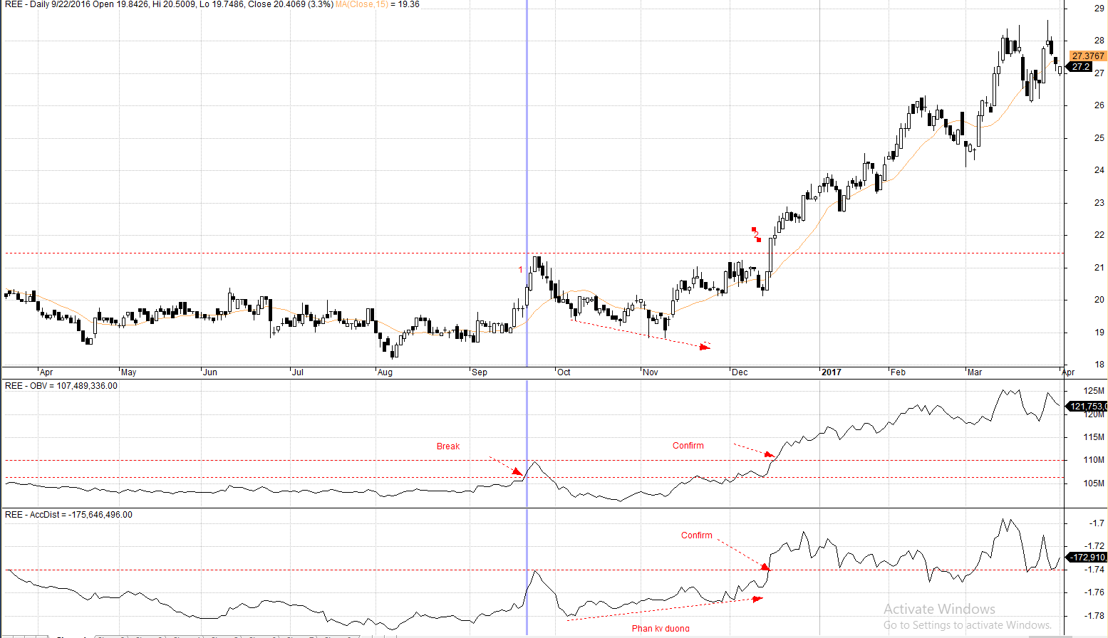 Tại điểm số 1, trong khi REE chuẩn bị tiến sát mức kháng cự 21.5 thì OBV đã thiết lập đỉnh cao mới. Theo phân tích của chỉ báo OBV, điều này tiên đoán khả năng REE sẽ vượt qua mức kháng cự 21.5. Tuy nhiên, vào giữa tháng 9.2016, toàn bộ thị trường chung giảm điểm và có lẽ phía các nhà giao dịch chuyên nghiệp cảm thấy không nên vội đẩy giá lên. REE điều chỉnh theo thị trường chung cho đến cuối tháng 11.2016.