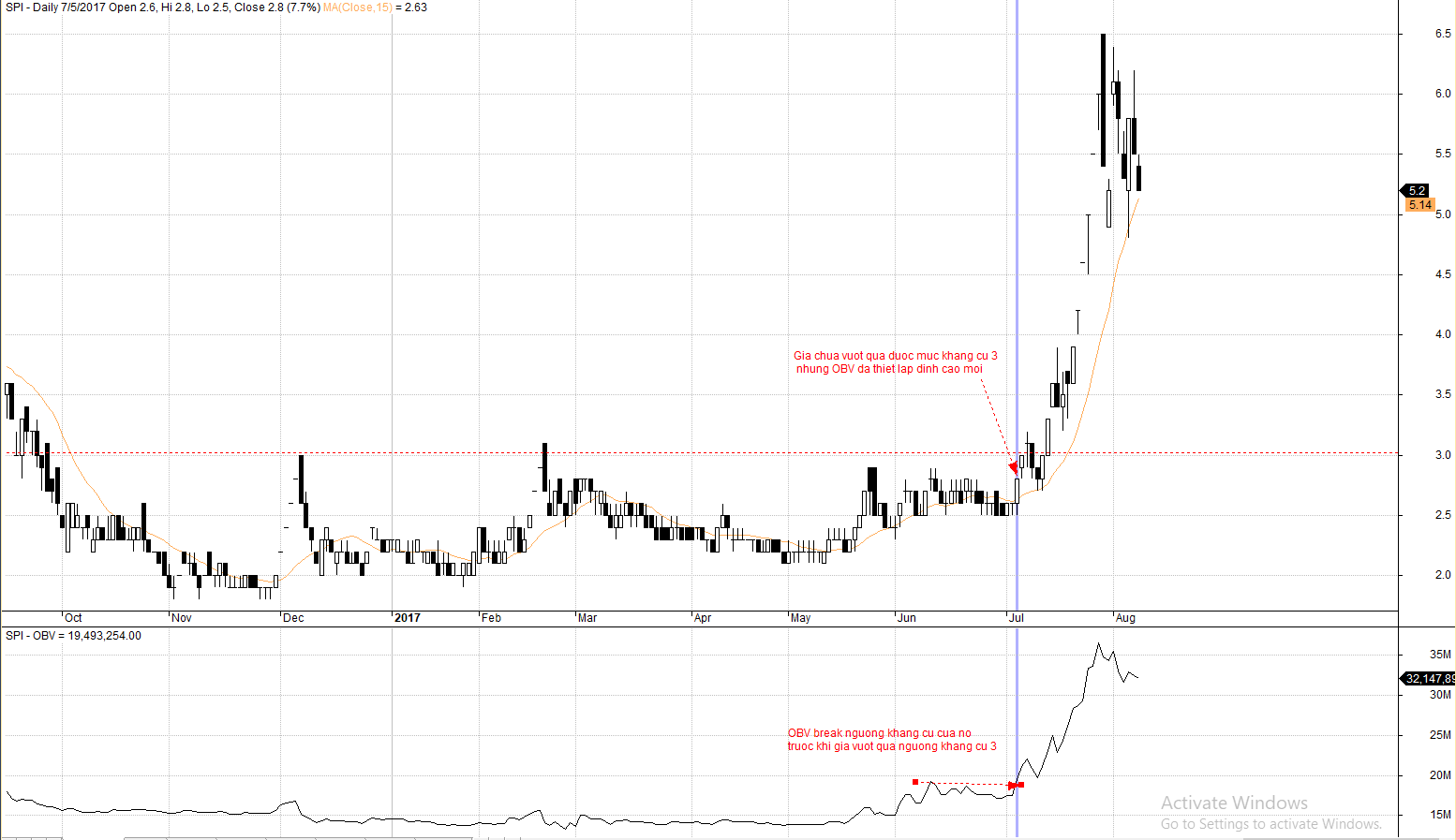 Các bạn có thể thấy rằng tại thời điểm đầu tháng 7, SPI đang tiến sát mức kháng cự tâm lý 3. Trong khi giá vẫn chưa phá vỡ đỉnh cũ thì chỉ báo OBV đã phá vỡ (break) đỉnh cũ trước đó và thiết lập đỉnh cao mới. Khi OBV thiết lập đỉnh cao mới, nó báo hiệu trước khả năng giá sẽ theo sau và phá vỡ mức kháng cự.