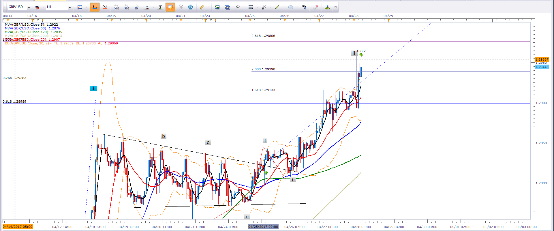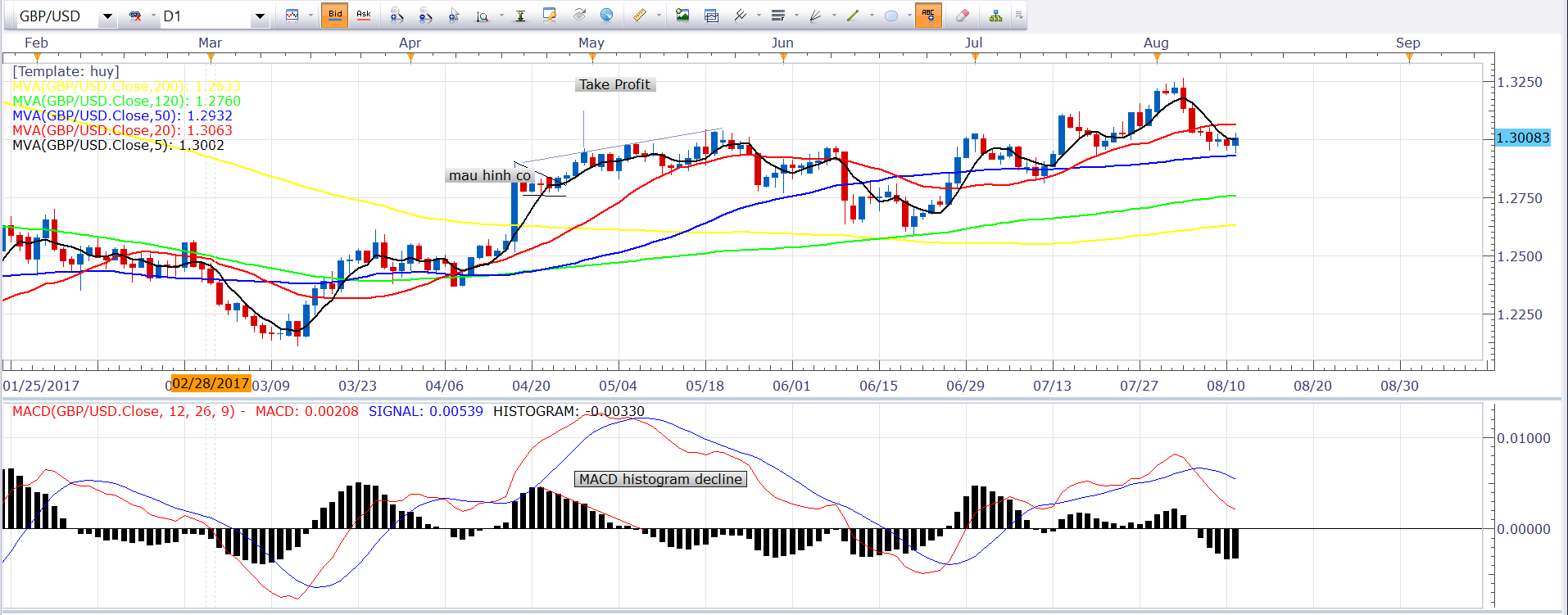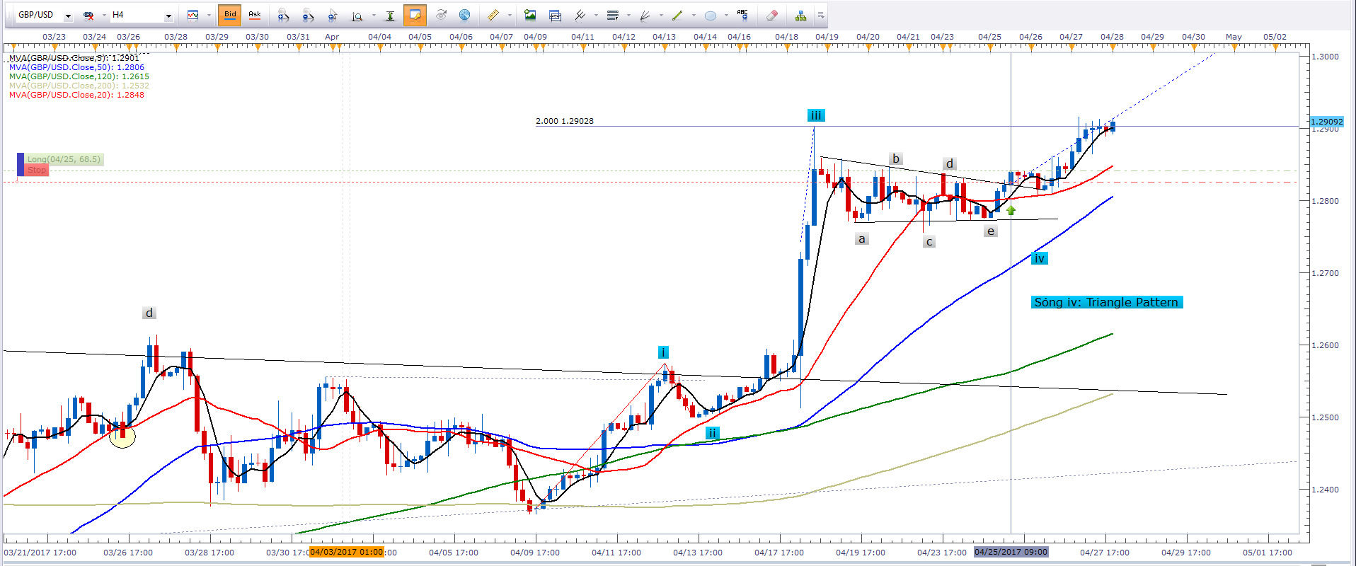Vào đầu tháng 4.2017, khi Thủ Tướng Theresa May kêu gọi Tổng Tuyển Cử sớm, Đồng Bảng Anh bất ngờ tăng vọt, sau đó có sự điều chỉnh theo mẫu hình cờ. Tôi biết rằng, đó là cơ hội tốt để giao dịch theo sau xu hướng trên đồ thị H4 bởi trên đồ thị Daily, giá đã vượt qua MA200 ngày.
