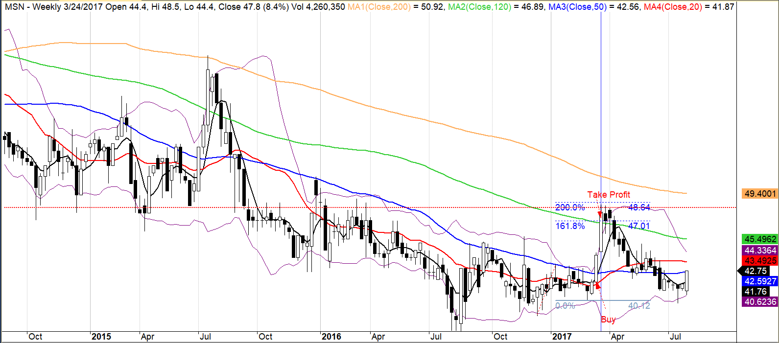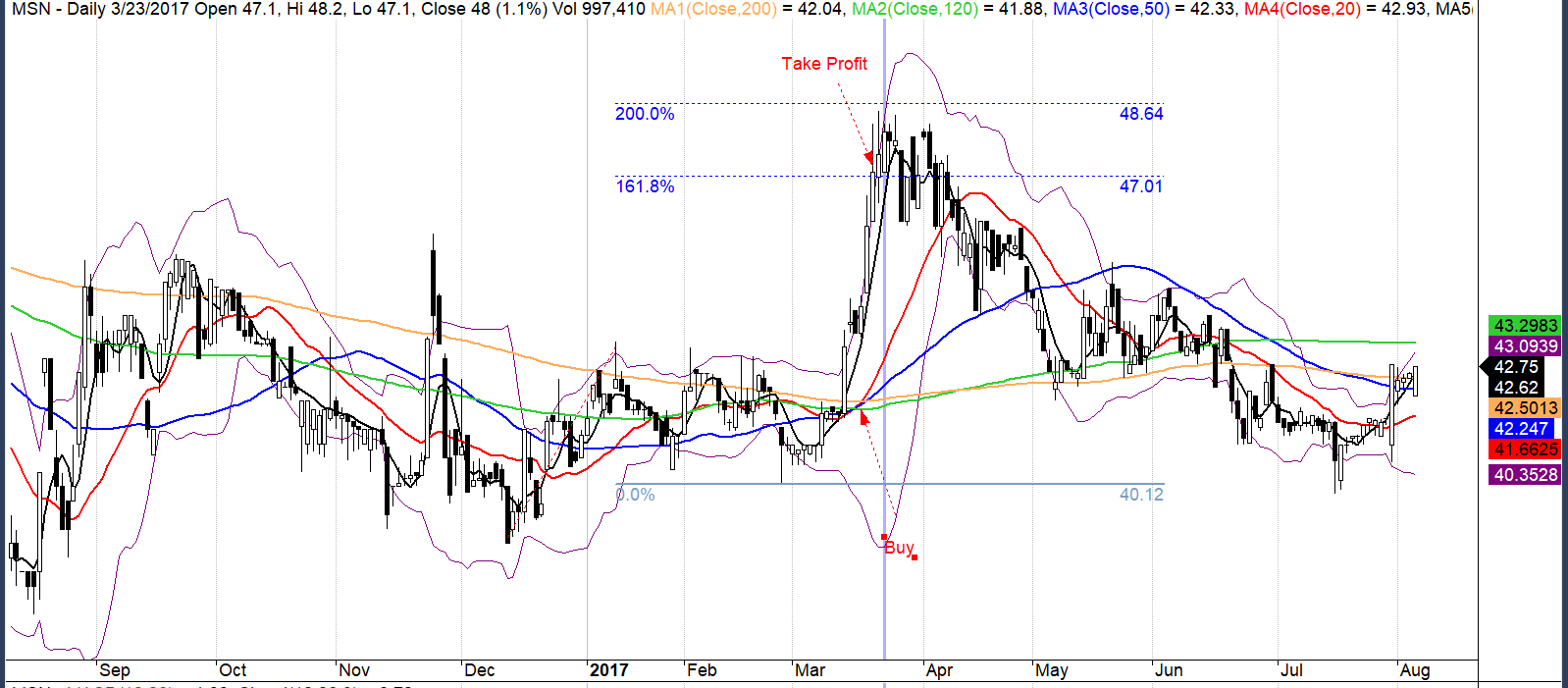 Vào ngày 9.3.2017, tôi thực hiện giải ngân vào MSN sau khi nhận thấy cấu trúc sóng Elliott vừa đủ cho kết thúc pha điều chỉnh. Sau đó ngày 14.3.2017, chiến lược Trend Following đối với MSN tại vùng giá 43 khi có điểm bung theo “mô hình cá sấu săn mồi”. Giá nằm trên MA200 ngày cho phép tôi thực hiện chiến lược Trend Following trên đồ thị ngày. 1 tuần sau đó, tôi chốt MSN tại vùng giá 47 khi chạm vào tỷ lệ Fibonacci 1.618.