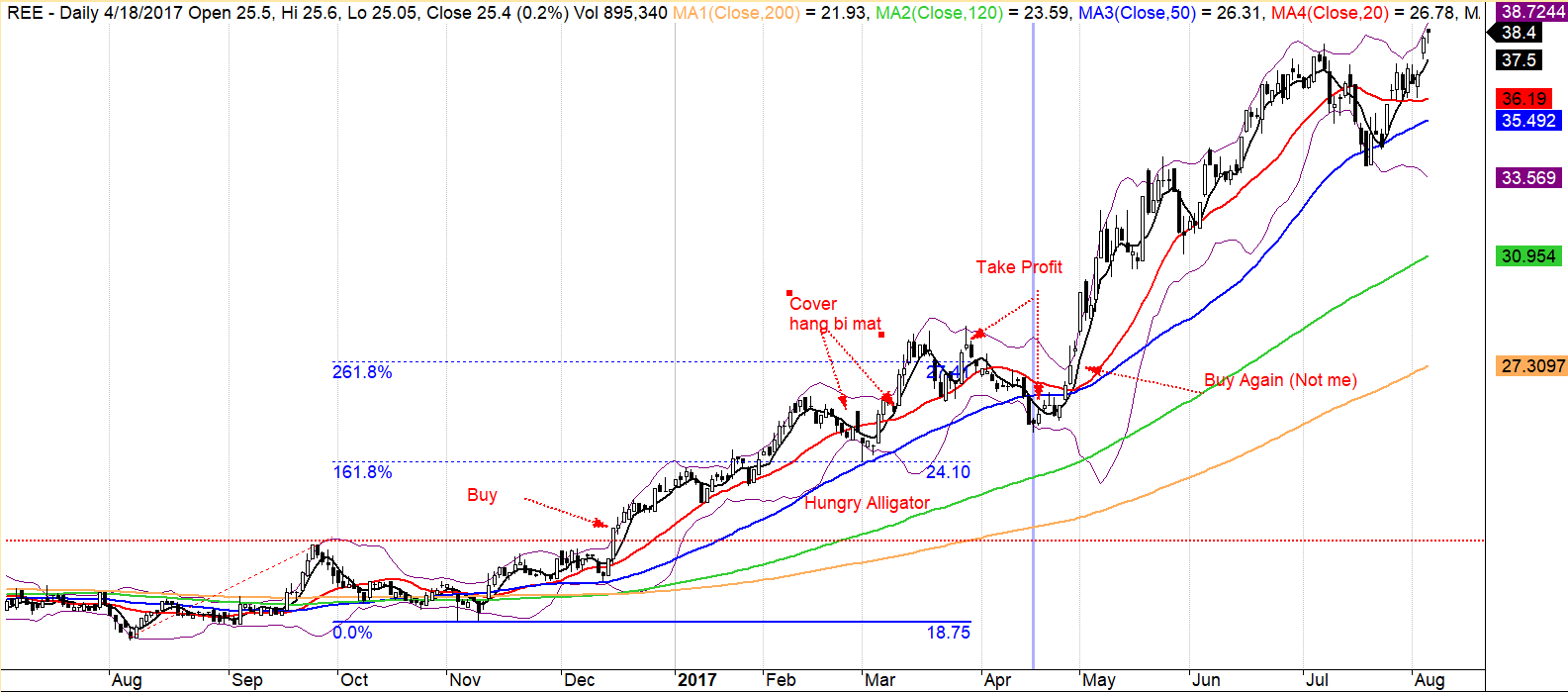Khi xác lập điểm take profit dài hạn, tốt nhất nên khóa toàn bộ lợi nhuận bằng đường MA50 ngày hoặc đôi khi là MA120 ngày. Trong đó, tôi ưa thích MA50 ngày hơn. Tôi lãi khoảng 20% sau 4 tháng nắm giữ REE.