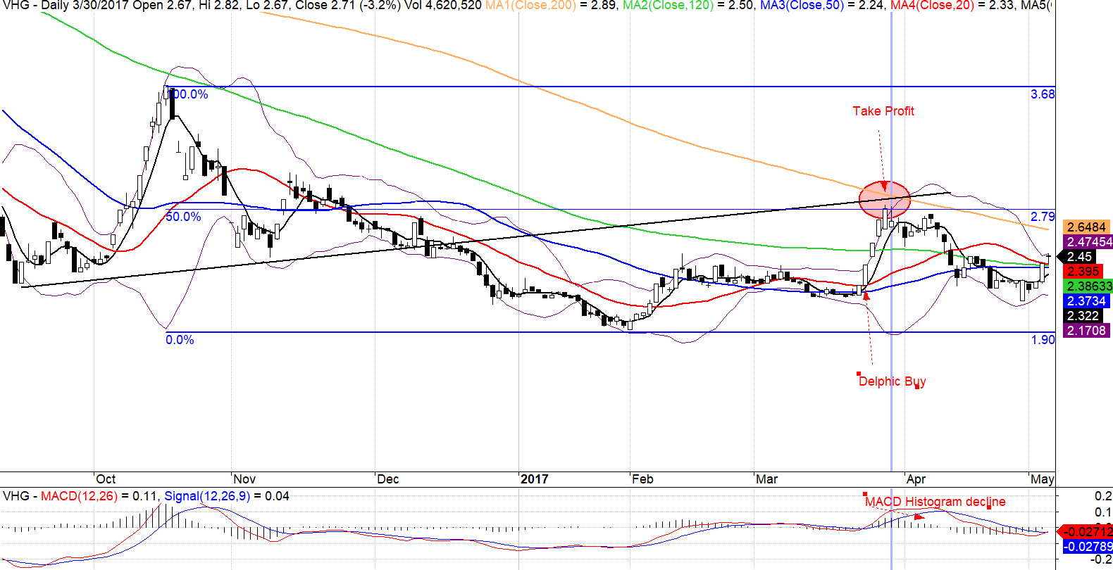 Chỉ vài ngày sau đó, khi nhận thấy VHG bị kháng cự bởi sự hội tụ của đường Trendline nội bộ, Fibonacci 50%, MA200 ngày, tôi lập tức chốt lãi tại đỉnh 2.79. Đó là một quyết định chính xác vì sau đó VHG giảm trở lại về đáy 2.3.