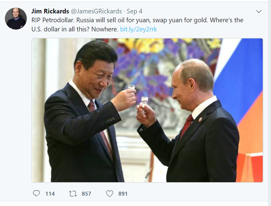 vào tháng 6.2017, Trung Quốc đã có bước đi đầu tiên để hướng tới thiết lập “Petroyuan (NDT dầu mỏ)” khi thiết lập mối quan hệ trực tiếp với Nga. Theo đó mối quan hệ mua bán dầu giữa Nga và Trung Quốc hiện nay đã được thực hiện bằng đồng NDT. Như vậy, mọi đồn đoán bây lâu đã thành hiện thực. Puttin và Tập Cân Bình. Tôi thích nhất là những bình luận của Jim Rickards, tác giả cuốn sách The New Case For Gold (Diện Mạo Mới của Vàng” và “Road to Ruin”, người tiên đoán chính xác Nga và Trung Quốc sẽ cùng nhau xây dựng đồng tiền RIP Petrodollar (Nga bán dầu để lấy đồng NDT, hoán đổi đồng NDT để lấy vàng)