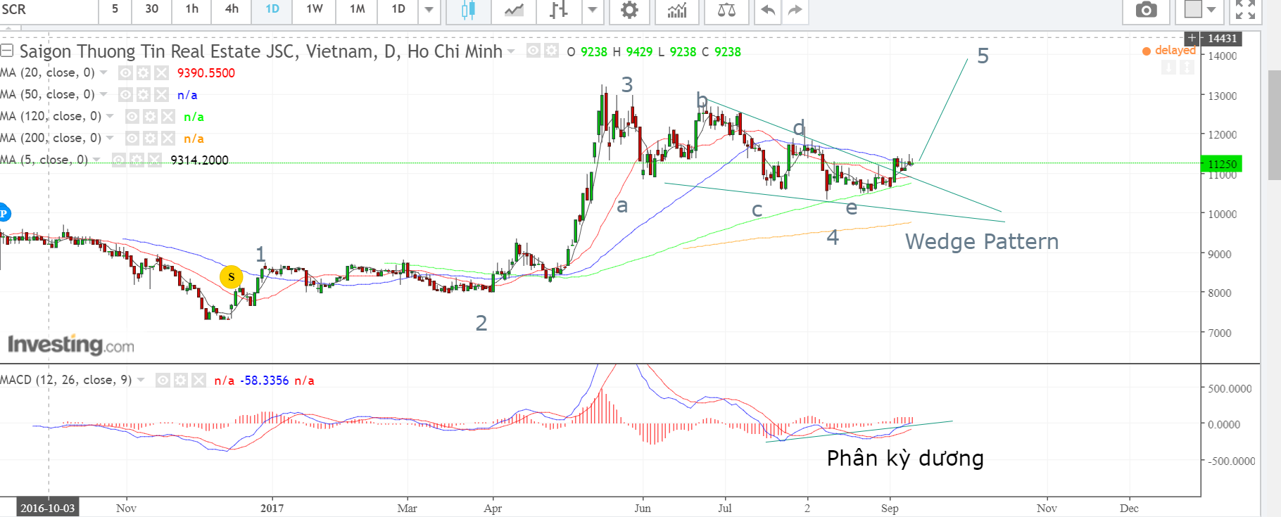 Ngày 11.9.2017, tôi nhận thấy SCR bắt đầu break ra khỏi mẫu hình chiếc nêm để hình thành tín hiệu tăng giá và hoàn thành tín hiệu phân kỳ dương.