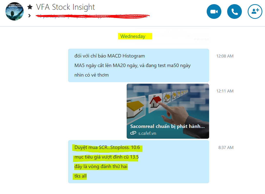 Trên diễn đàn Skype Room của VIETNAM STOCK INSIGHT, tôi khuyến nghị mua SCR ở vùng giá 11.3-11.4. Stoploss đặt ở 10.6. Đến phiên giao dịch ngày 18.9.2017, SCR đang giao dịch tại giá 11.9 và đang mang lại lợi nhuận cho các trader (cổ phiếu cũng đã về tới tài khoản). Đây là vòng đánh thứ 2 sau đợt mua vào tháng 5.2017.
