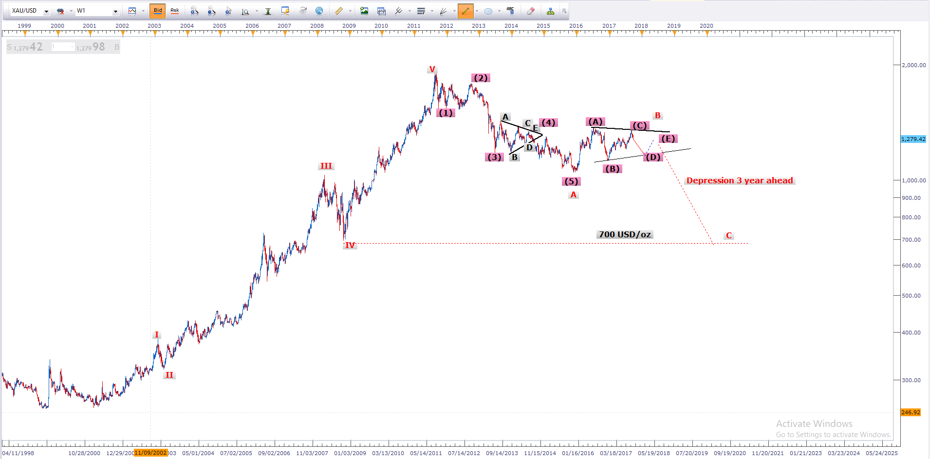 Góc nhìn sóng Elliott dài hạn, mục tiêu 700 USD/oz trong vòng 3 năm tới.