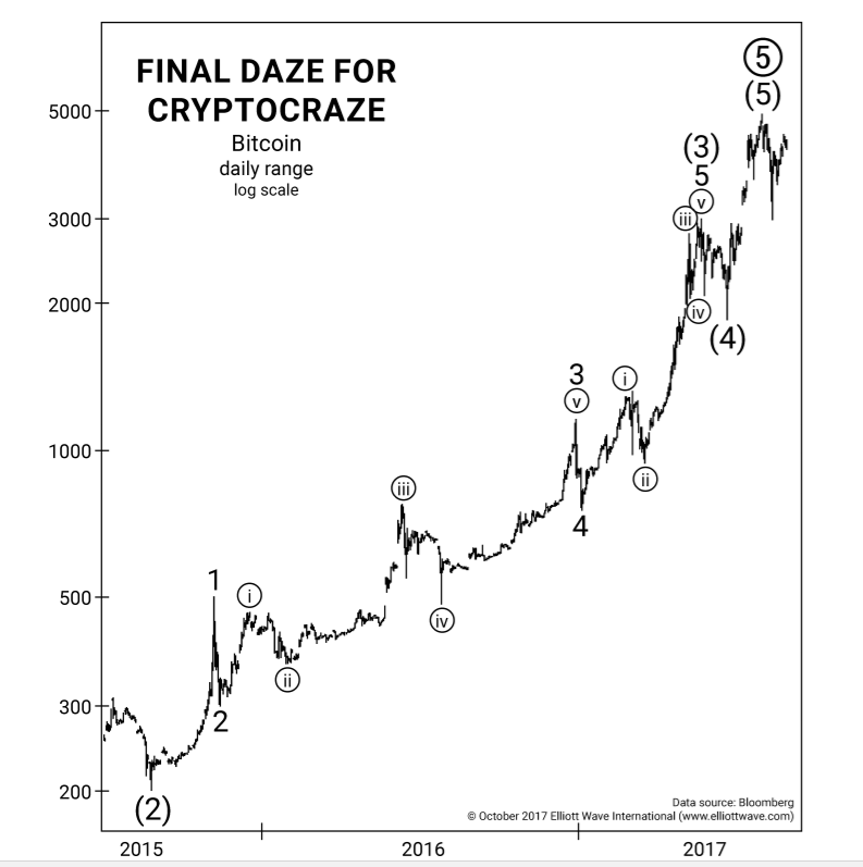 Không nhiều lời tại nơi cần phải nói ngắn. Một bức tranh hay có giá trị hơn ngàn lời nói. Bong bong Bitcoin đã đạt đỉnh sóng 5 (vòng tròn) của mô hình Elliott Wave, báo hiệu sự đổ vỡ sắp diễn ra.