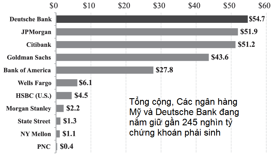 Hầu hết mọi người sẽ nghĩ, rủi ro lớn nhất hiện nay là các ngân hàng lớn ở Hoa Kỳ – chẳng hạn như JPMorgan đang có sự hiện diện 51,900 tỷ USD trên thị trường phái sinh trị giá 550,000 tỷ USD. Nhưng mọi người đã sai lầm. Cái tên nguy hiểm nhất hiện nay là Deutsche Bank. Tại thời điểm cuối năm 2016, ngân hàng Deutsche Bank đang hiện diện 54,700 tỷ USD trên thị trường phái sinh.
