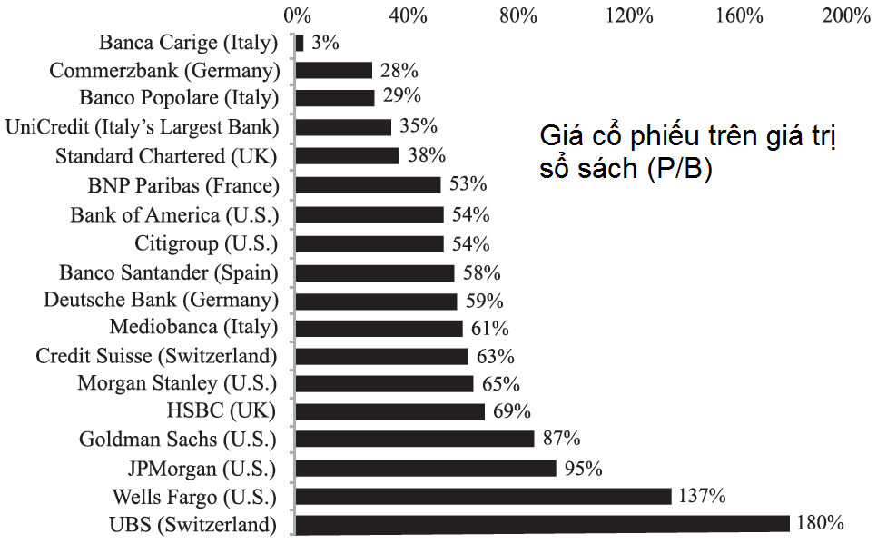 Như bạn thấy trong 2, cổ phiếu Deutsche Bank đang chiết khấu 59% so với giá trị sổ sách. Ngân hàng UBS của Thụy Sĩ là mạnh nhất với mức giá bằng 180% giá trị sổ sách, trong khi ngân hàng Banca Carige của Italia gây sốc với mức giá cổ phiếu chỉ bằng 3% giá trị sổ sánh. Rõ ràng, Châu Âu đang dẫn đầu trong cuộc khủng hoảng ngân hàng.