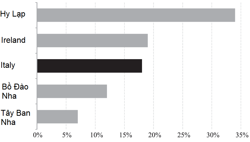 Một ngòi nổ khác đến từ Châu Âu, đặc biệt là Italia. Hình 3 thể hiện nợ xấu ở các quốc gia thuộc khu vực có nhân khẩu học tệ nhất và khả năng cạnh tranh yếu nhất Châu Âu: Vùng Nam Âu (ngoại trừ Ireland).