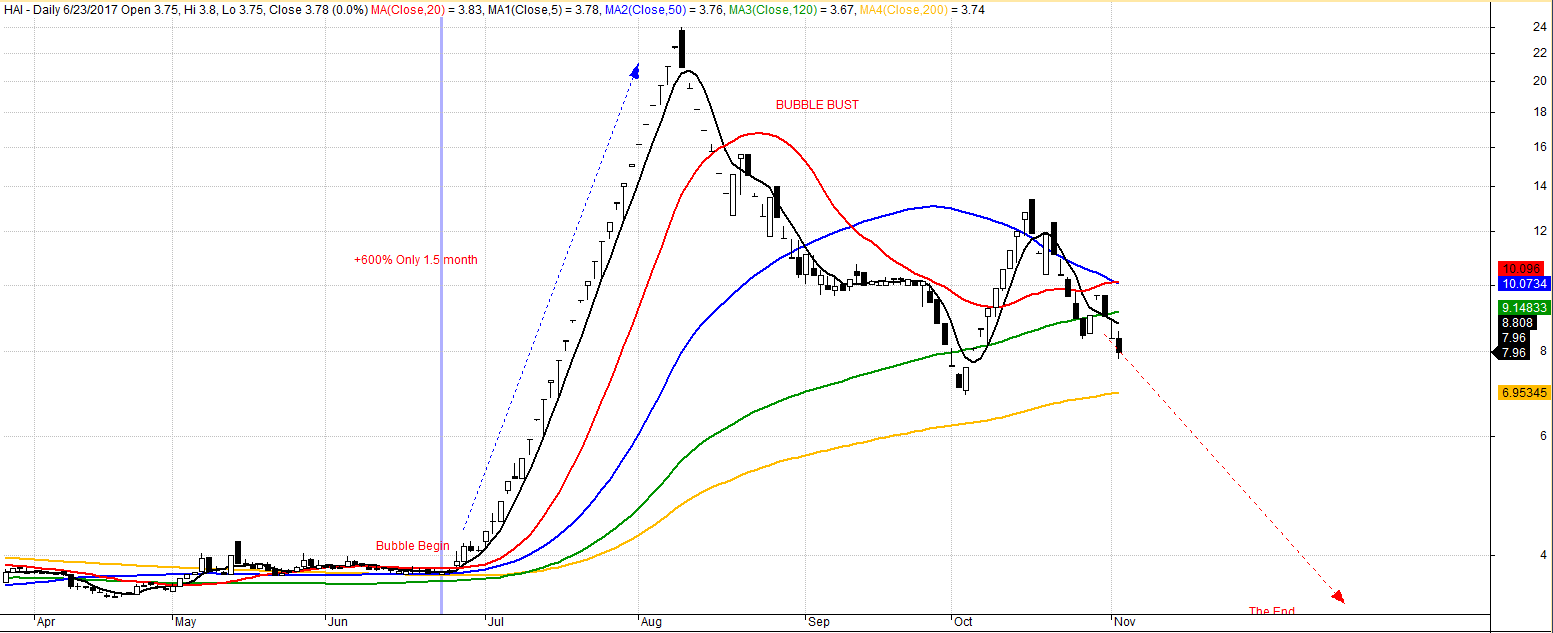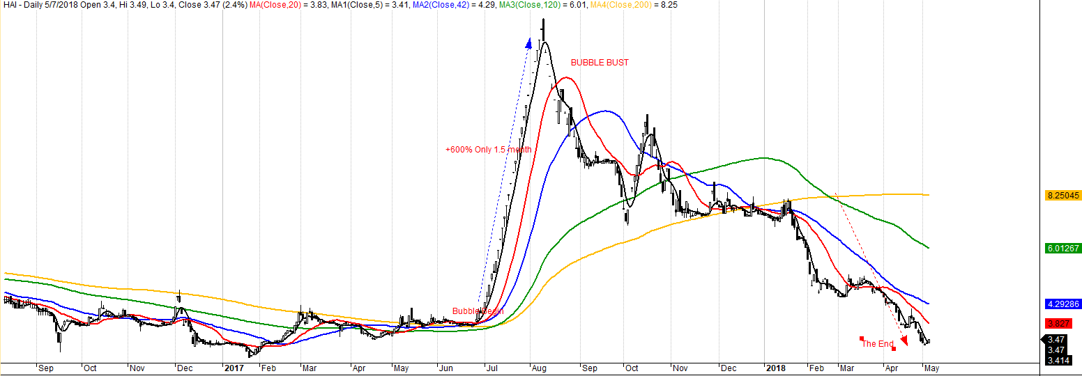 Và đây chính là những gì đang diễn ra với HAI. Giá cổ phiếu HAI tăng 600% chỉ trong 1.5 tháng. Sau đó, đột ngột mất thanh khoản và giảm sốc. Đỉnh hình thành theo chữ V ngược. Không hề có tín hiệu gì báo trước, cổ phiếu đột ngột sàn và trăng bên mua dù những phiên trước đó tím và trắng bên bán. Những người am hiểu về bong bóng sẽ luôn né tránh tham gia giao dịch vào những cổ phiếu như vậy.