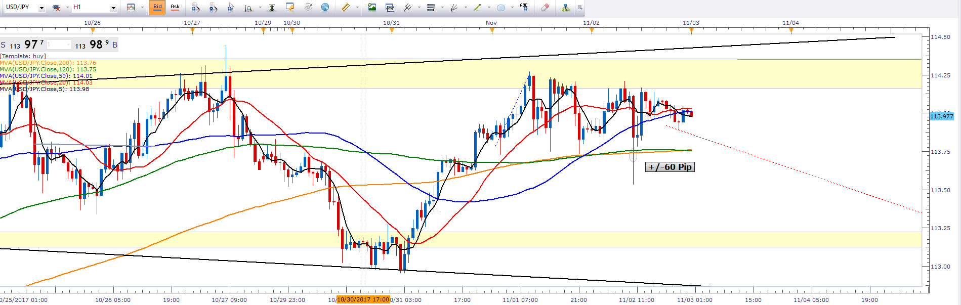 Quả nhiên, độ biến động thị trường rất mạnh khi Donald Trump công bố ông Powell đắc cử chủ tịch Fed. UJ giảm nhanh 60 pip, thủng support bởi MA120 và MA200 trên H1 rồi tăng giá trở lại..Thị trường sideway đi ngang.
