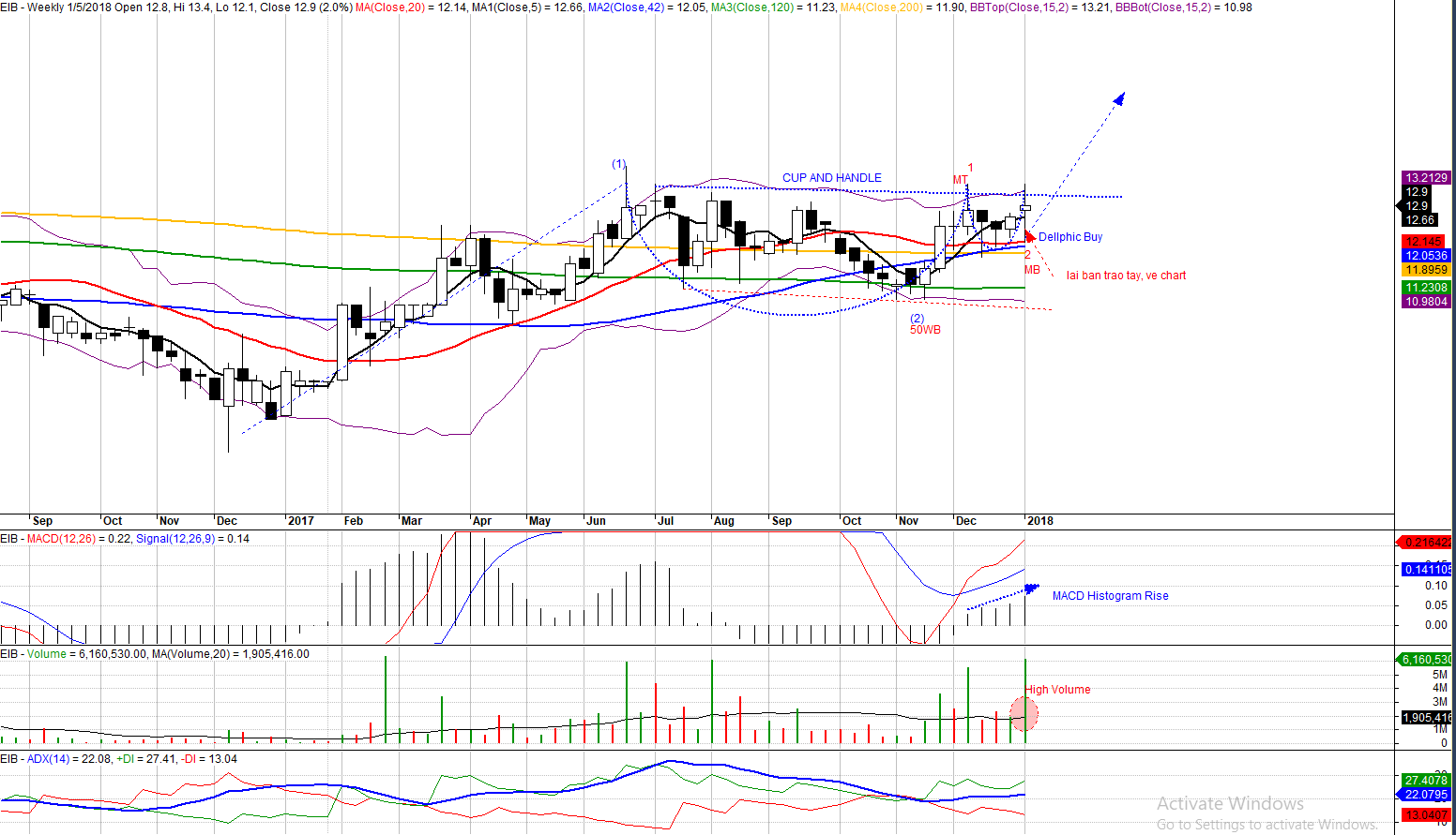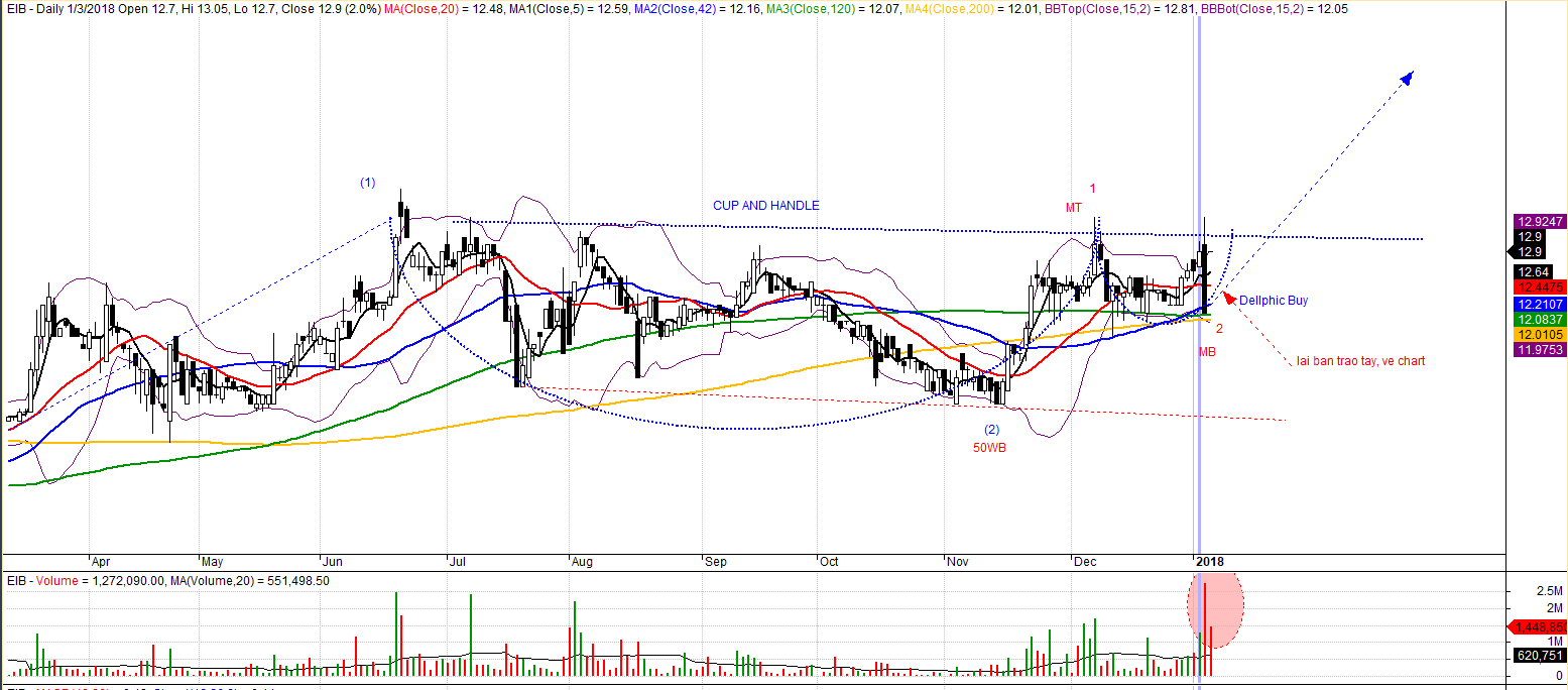 + Mẫu hình Dellphic Buy xuất hiện. Có một câu chuyện khá thú vị với EIB trong hai phiên giao dịch cuối tuần. Vào phiên giao dịch ngày 4.1.2017, EIB bị lệnh lớn hơn 1.2 triệu với giá gần sàn chất ra bán khiến cổ phiếu giảm mạnh. Giá giảm dưới cả MA50 ngày và chạm vào MA120 ngày, MA200 ngày đang nằm sát bên dưới. Mẫu hình Dellphic Buy bị vi phạm. Nhưng theo tôi được biết, thực ra đây là hành động bán vẽ chart của lái. Lái bán tay này cho tay kia (thực chất là một) (với mục đích gì thì hỏi ổng). Ngày 5.1.2017, giá tăng trần trở lại và nằm trên MA20 ngày. Mẫu hình Dellphic Buy vẫn được giữ nguyên giá trị. Đối với nhưng ai theo dõi EIB thì biết cổ phiếu này thường hay bị “úp sọt” cuối phiên là chuyện thường.