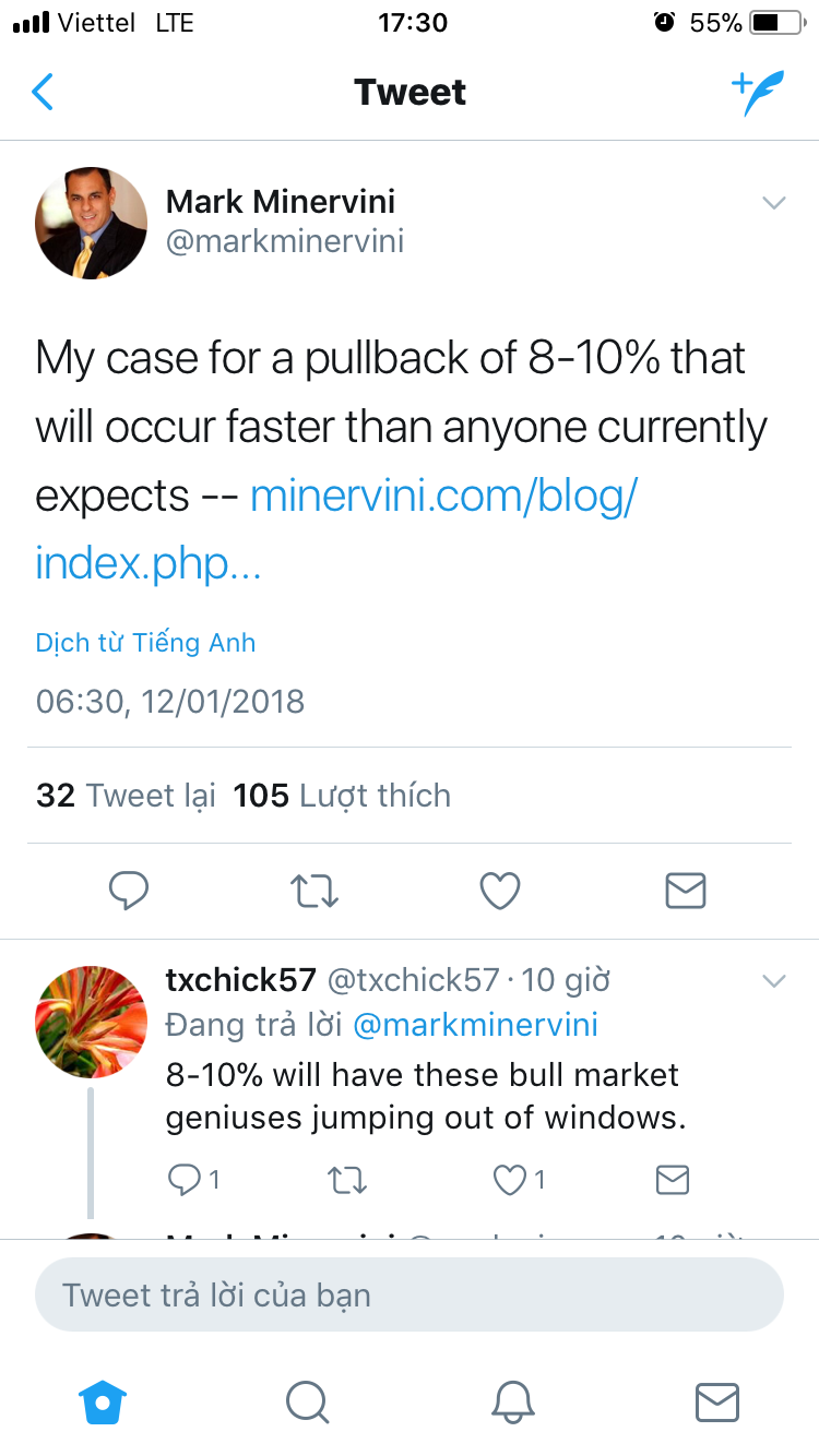 Trên trang Twitter cá nhân, phù thủy Mark Minervini kêu gọi cảnh giác với khả năng thị trường chứng khoán Mỹ có thể giảm 8-10% trong thời gian tới.