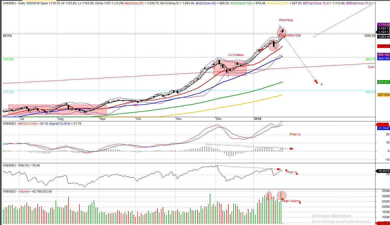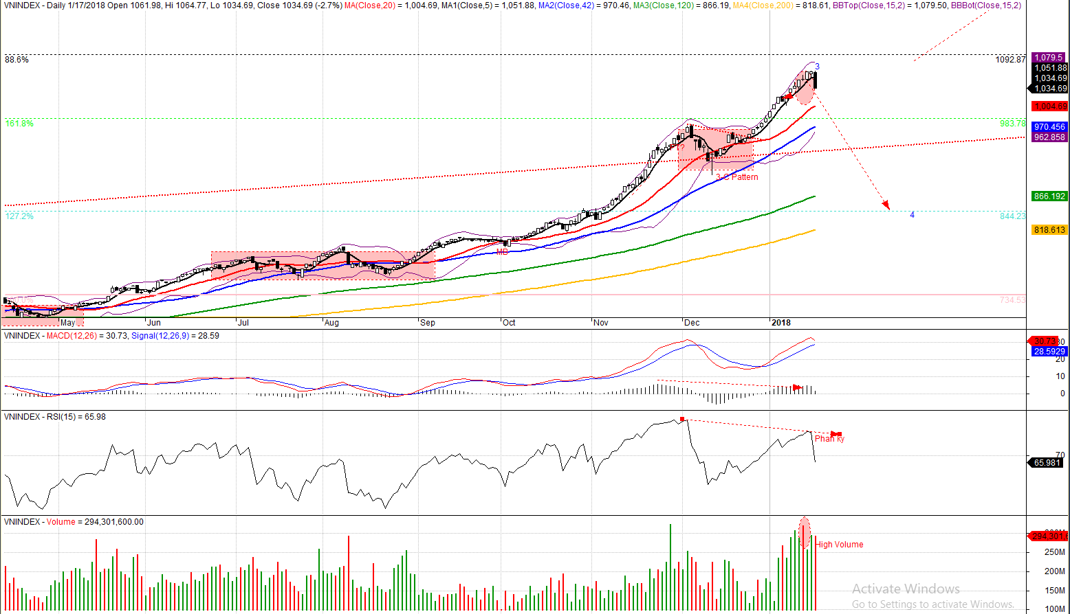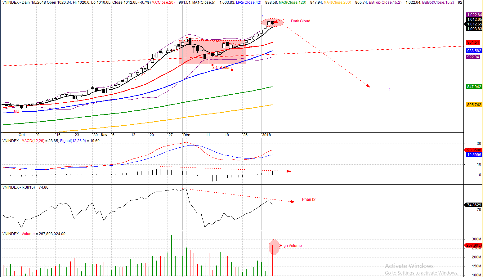 [Update ngày 17.1.2018] Chỉ số VN-Index xuất hiện mẫu hình Đám Mây Đen Che Phủ, báo hiệu kết thúc sóng 3. Vol cao. Hoàn tất phân kỳ âm giữa giá và RSI.