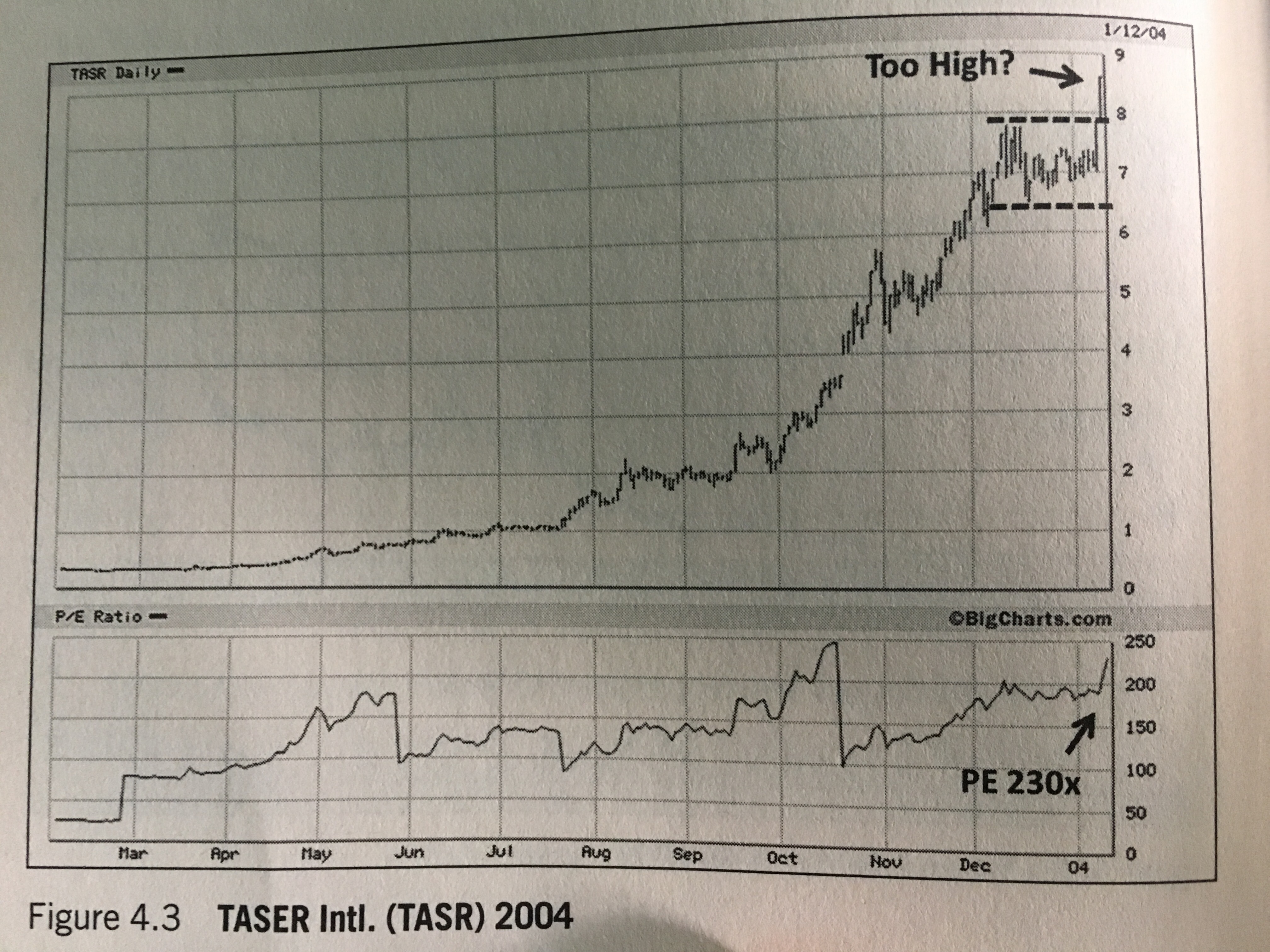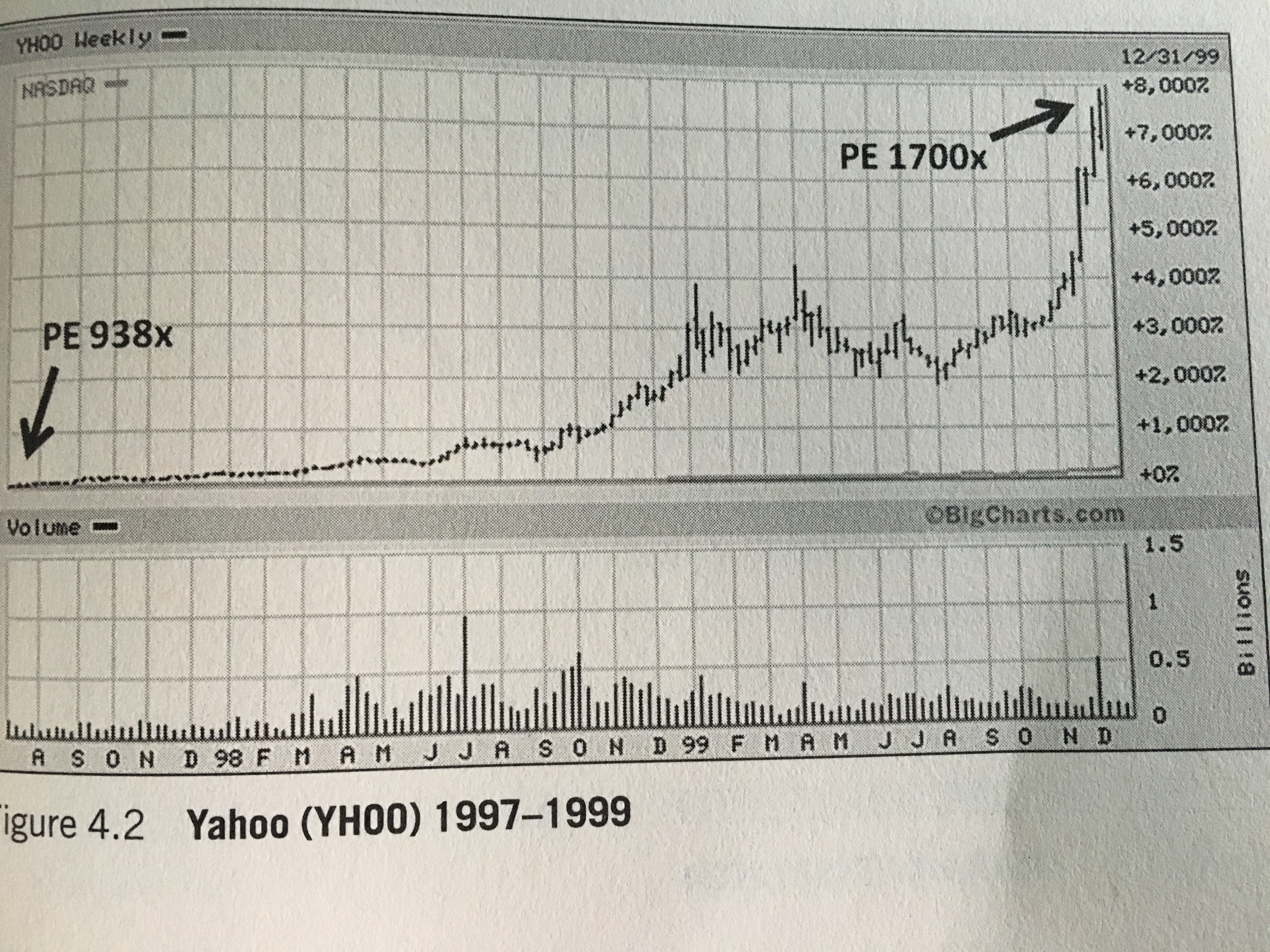 Nếu bạn một cổ phiếu có P/E 938 lần là quá cao thì đó là một sai lầm. Cổ phiếu Yahoo mà Mark Minervini từng mua có P/E 938 lần nhưng sau đó giá cổ phiếu tăng 8,000% để đạt P/E tới 1,700 lần. Đây chính là lúc mà bong bóng cổ phiếu công nghệ hình thành. Trong cơn điên, mọi người sẽ định giá tài sản cao một cách điên rồ. Nó là một bong bóng và giống như George Soros nói: “Nếu nó là một bong bóng, tôi sẽ mua bong bóng đó”.