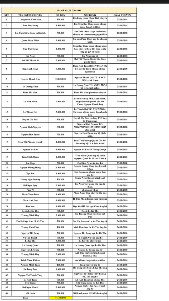 Kết thúc chiều này ngay 24/01/2018 số tiền nhận được 71.4 triệu anh em nhé. Của ít lòng nhiều, một đồng cũng quý. Giúp người – giúp mình!