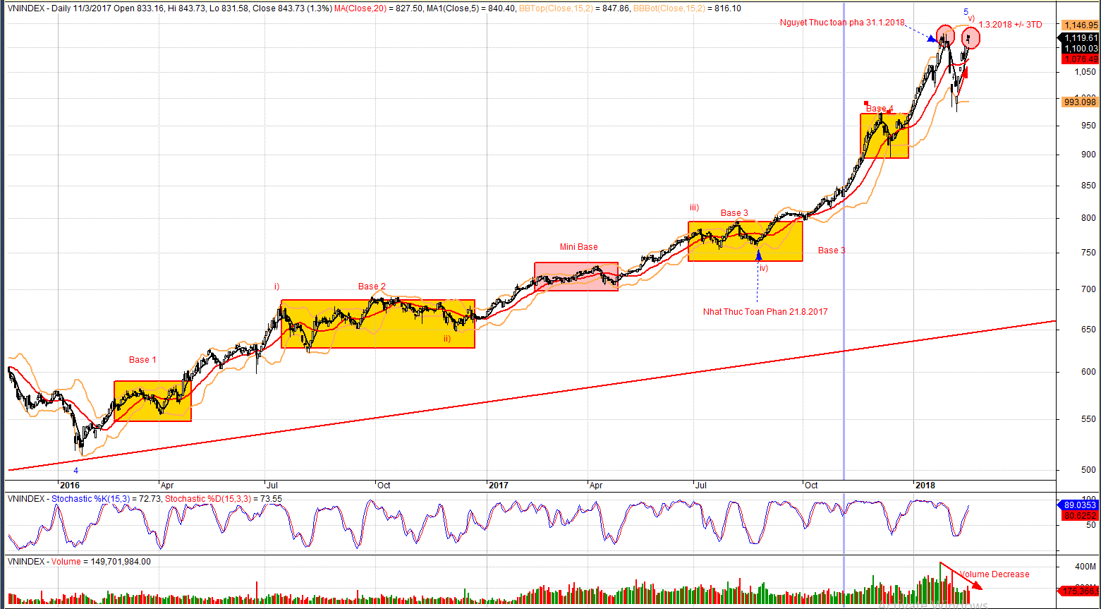 Mark nói về phương pháp đếm nền giá để cho biết bạn ở đâu nên mua vào và chốt lợi nhuận. Đồ thị dưới cho thấy VN-Index đã hoàn tất nền giá thứ 4 (thậm chí là nền giá thứ 5 nếu như tính cả nền giá nhỏ). Mark cảnh báo các nền giá thứ 5 hoặc thứ 6 trở nên nguy hiểm để mua vào. Chúng ta thấy từ đầu năm 2018 đến nay, nên giá hiện tại đang có cấu trúc “rộng và lỏng”, một dấu hiệu cực kỳ nguy hiểm và Mark không khuyến khích giao dịch theo xu hướng trong trường hợp này. Thay vào đó, ưu tiên mua bán theo chiến lược dao động (swing trading), nói nôm na là “mua đỏ, bán xanh”. Chỉ báo Stochastic Oscillator là công cụ cực kỳ hữu ích khi mua bán theo dao động.