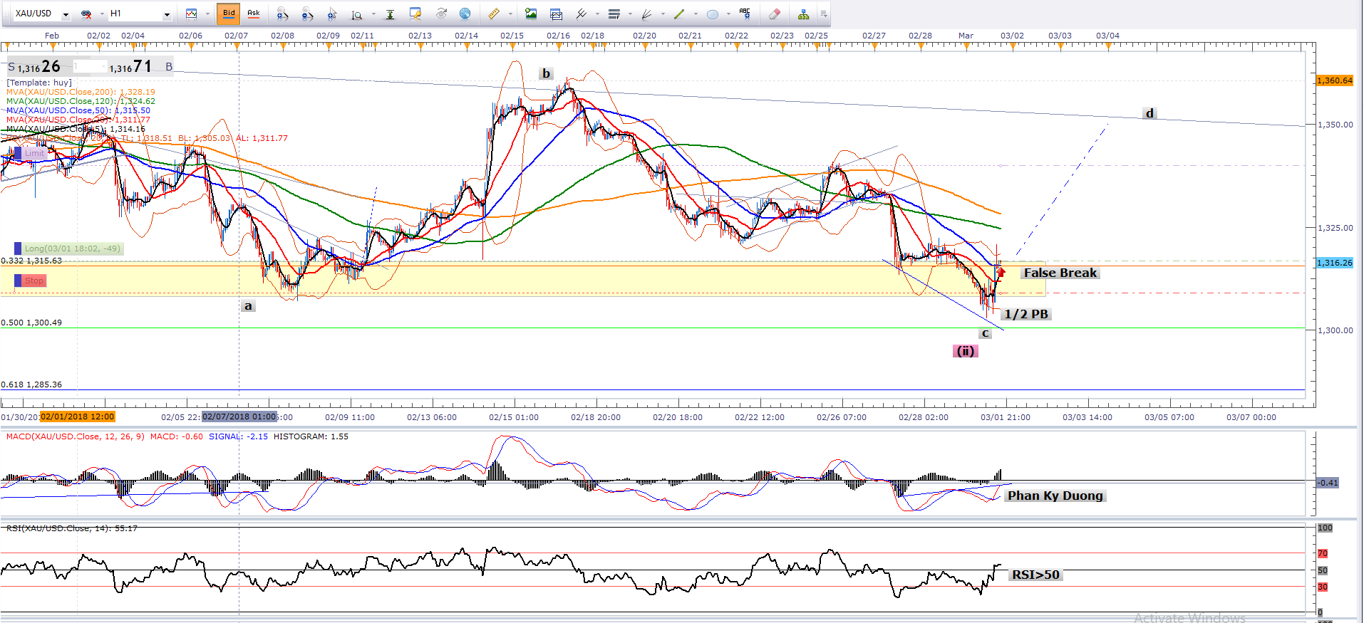 Trader có thể long tại vùng giá 1316, Stoploss đặt ở 1307 (dưới MA 20 trên H1) và mục tiêu giá limit bằng 1,340-1,350. Tỷ trọng giải ngân tương ứng với RIsk=1.5% Equity.