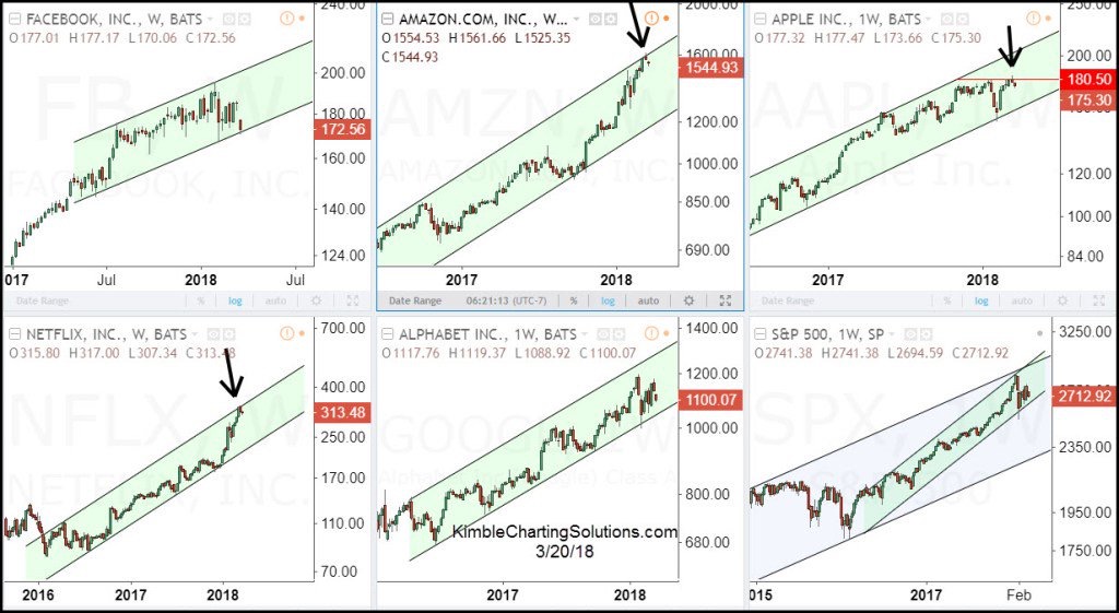 Hãy xem qua đồ thị của một loạt cổ phiếu công nghệ, bao gồm cả Facebook bởi bê bối dữ liệu trong mấy ngày gần đây. Facebook đang test cạnh dưới của kênh, Apple đang có vẻ như không vượt qua được đỉnh củ (tiềm năng tạo mẫu hình hai đỉnh).