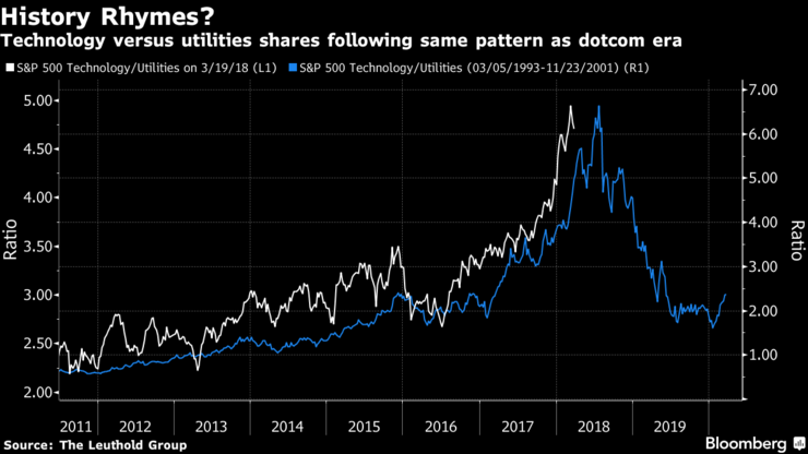 Các nhà phân tích kỹ thuật vẫn thường nói: “Tương lai sẽ lặp lại những gì trong quá khứ”. Một nhà quản lý quỹ nổi tiếng ở Phố Wall là ông James Paulsen (người đã tiên đoán đúng cuộc khủng hoảng 2001), đã nói với Bloomberg về bức hình sau. Bức hình cho thấy diễn biến hai nhóm ngành công nghệ (Technology) và Tiện Ích Công Cộng (Utilities) cho đến ngày 19.3.2018 đang có cùng diễn biến y hệt như thời kỳ bong bóng Dotcom (1993-2001). Paulsen nói: ” Giống như cuối những năm 1990, các nhà đầu tư hiện nay đang đổ tiền vào hai kênh đầu tư phổ biến (công nghệ và tiện ích công cộng đang là trụ đỡ của thị trường chứng khán Mỹ).