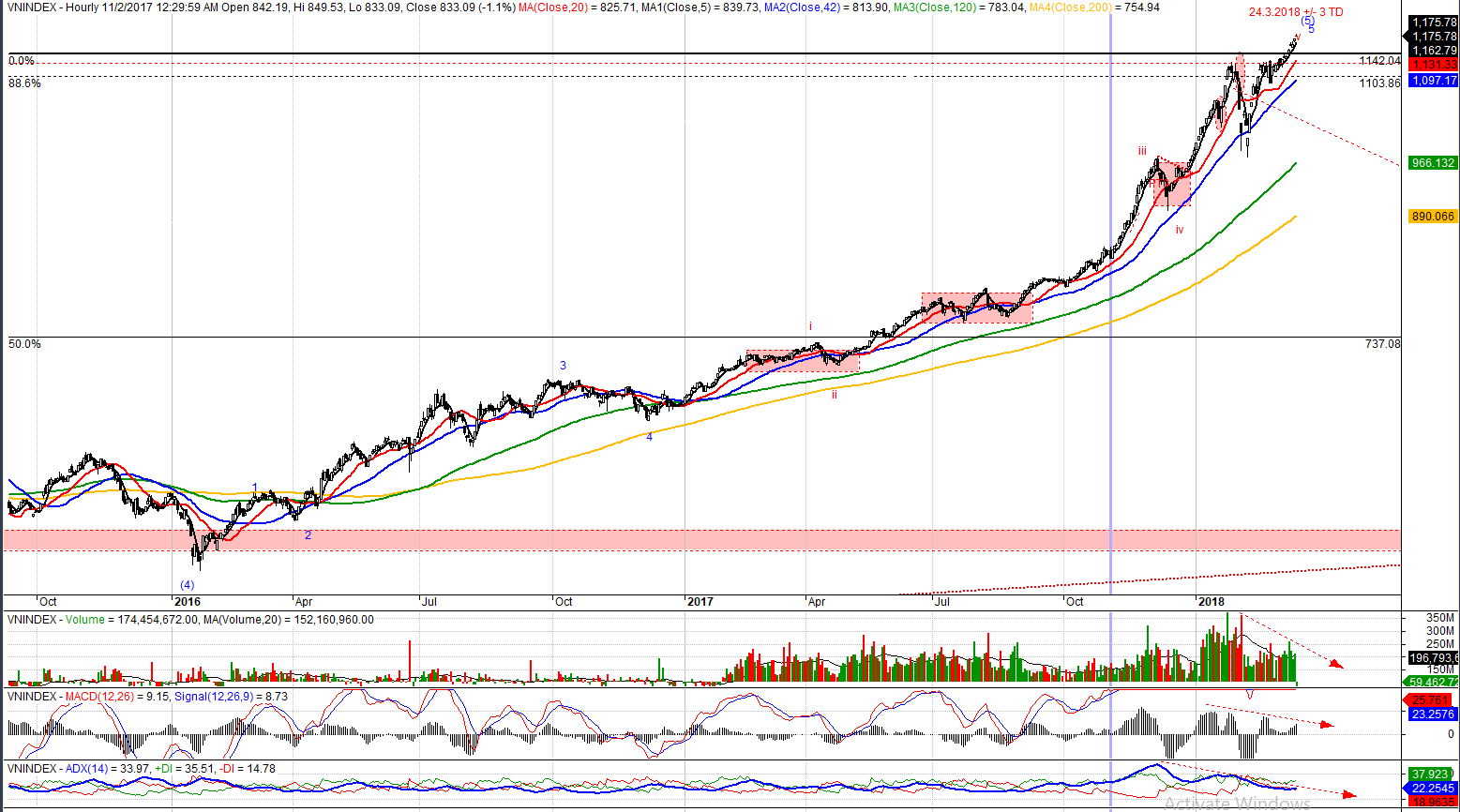 Cấu trúc sóng Elliott cho thấy đang hoàn tất đủ 5 năm. Các dấu hiệu phân kỳ giữa giá với khối lượng, MACD Histogram, ADX đang có khả năng xuất hiện.