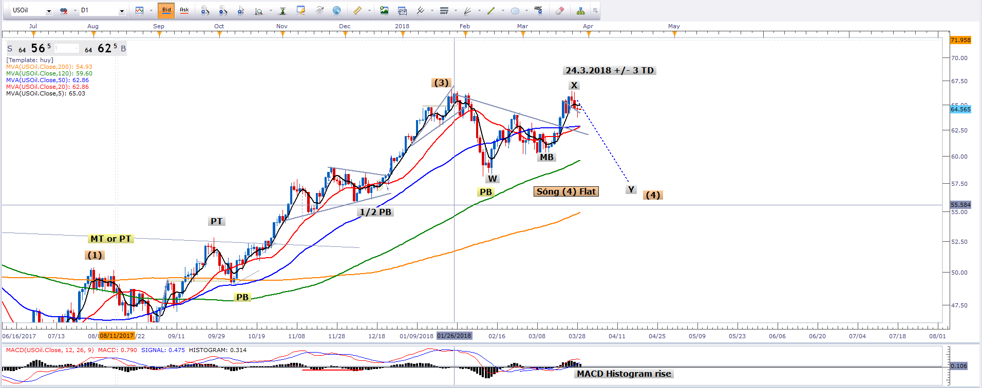 Phân tích Doanh Nghiệp Giá dầu và chứng khoán có thể cùng giảm trong thời gian tới Posted on 29 Tháng 3, 2018 by Huy truong minh Cấu trúc sóng Elliott cho thấy sóng (4) của Oil có thể diễn ra dạng Flat hoặc các biến thể phức hợp khác. NGày đảo chiều chiêm tinh tài chính 24.3.2018 +/-3 ngày giao dịch đang có tác động mạnh đến sự đảo chiều của giá dầu. Sau tuyên bố chiến tranh thương mại, Tổng Thống Trump đang có kế hoạch trừng trị các công ty Trung Quốc đầu tư vào Mỹ. Vụ nổ lớn của bong bóng Bitcoin và con số kế tiếp 3,500 USD