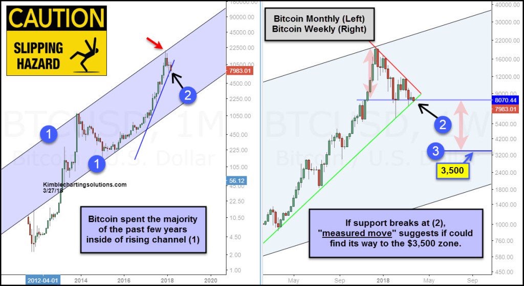 Bitcoin trên đồ thị tháng (trái) đang chạy trong kênh xu hướng. Nếu như đường hỗ trợ màu xanh bị phá vỡ, giá cần phải giảm về đường dưới của kênh xu hướng. Trên biểu đồ tuần (phải). Bitcoin đang hình thành tam giác giảm giá. Nếu tam giác này bị phá vỡ, mục tiêu giá sẽ là 3,500 USD.