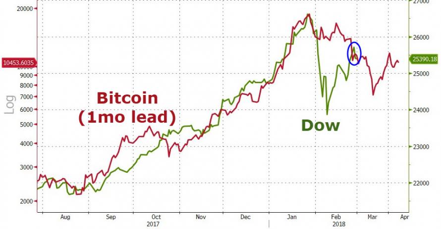 Đồ thị dưới đây thể hiện mối quan hệ giữa diễn biến giá Bitcoin (1 tháng trước đó) và chỉ số DJIA . Mối quan hệ là rất chặt. Do đó sự sụp đổ của Bitcoin trong thời gian gần đây đang cảnh báo khả năng sụp đổ của TTCK Mỹ. Rất nhiều trader trên thị trường đang chú ý đến mối quan hệ này.