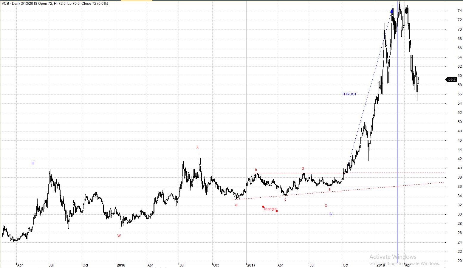 Sự tăng giá sau khi xuất hiện mẫu hình sóng Elliott được gọi là “KIẾM ĐÂM (THRUST) vì giá tăng nhanh và mạnh giống như một mũi kiếm đâm. Hãy xem đồ thị của cổ phiếu VCB (Vietcombank). Mẫu hình sóng tam giác được hoàn tất vào tháng 10.2017 tạo nên cơn sóng tăng cực mạnh của VCB (giá tăng gần gấp đôi trong 5 tháng). Mẫu hình sóng Tam Giác kết thúc cấu trúc sóng hiệu chỉnh đôi (Double Three) xuấtie ện ở sóng IV. Thật đơn giản phải không nào. Điều quan trọng là bạn phải kiên nhẫn khi chờ đợi tín hiệu giao dịch theo sóng tam giác.