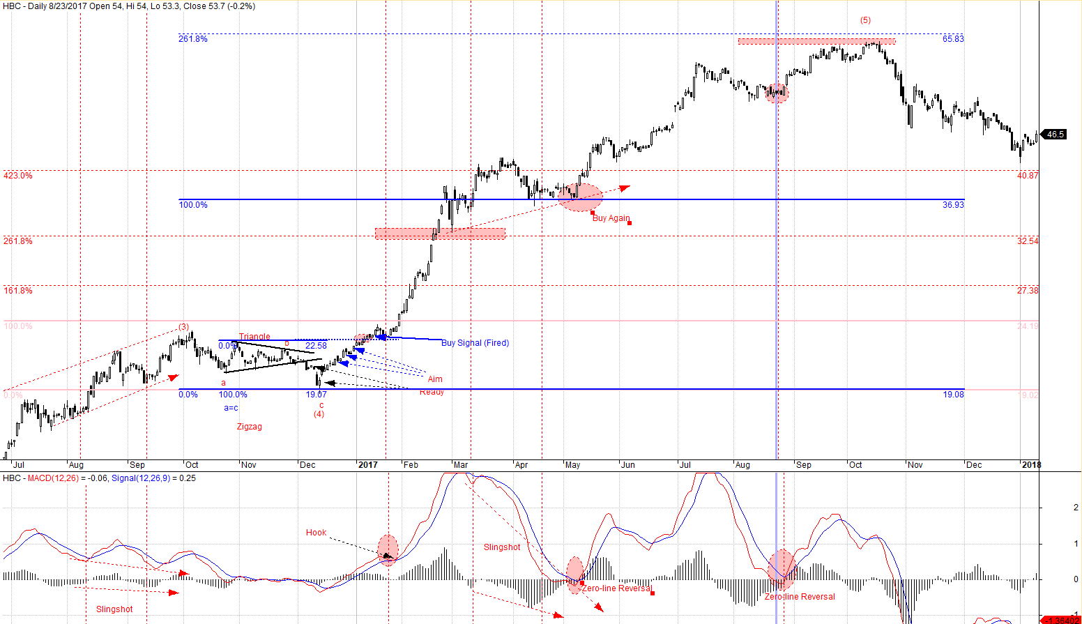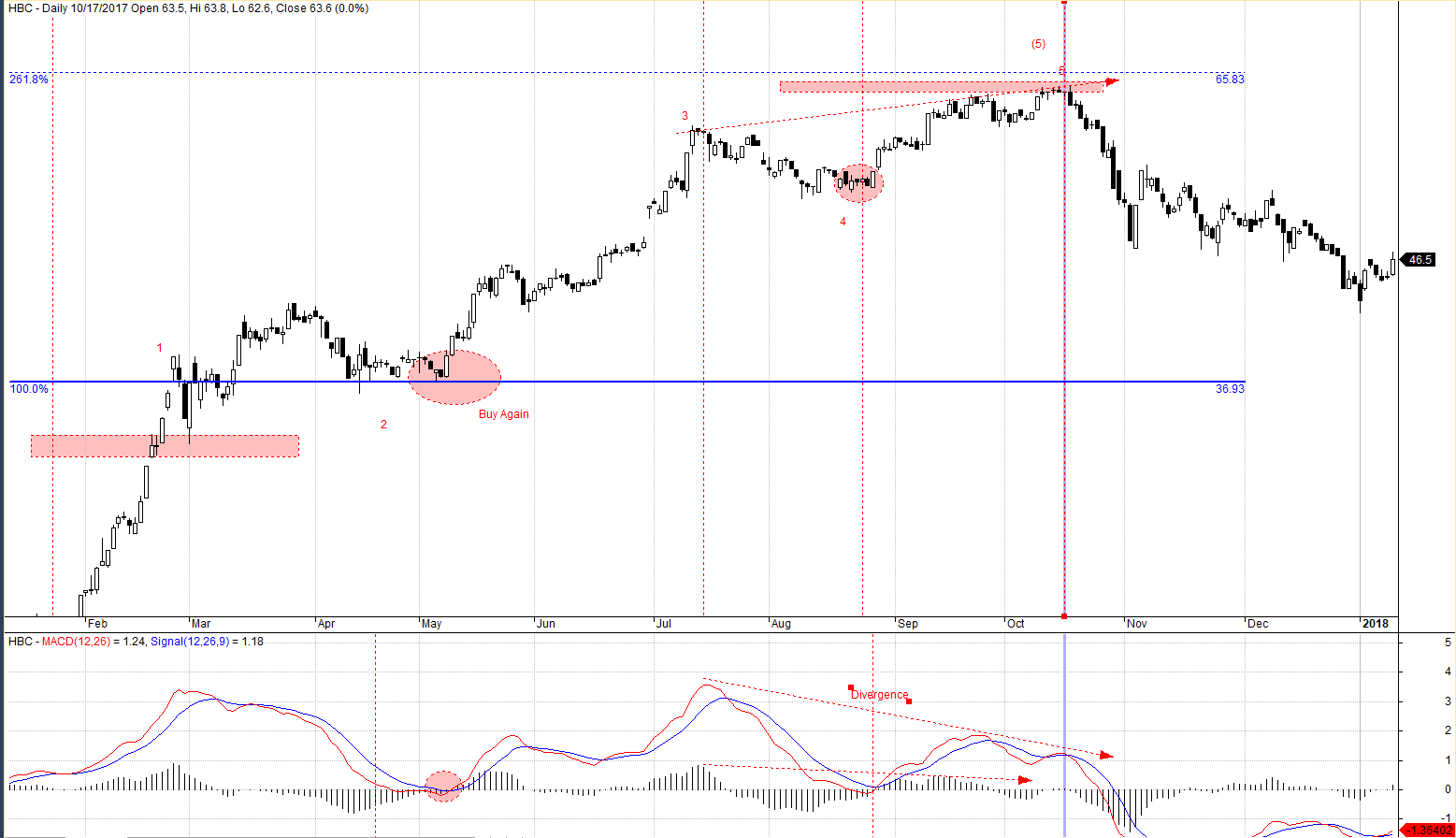 Trên đồ thị của HBC, đỉnh sóng 3 vào tháng 7/2017 là khi MACD đạt mức cao nhất kể từ tháng 4.2017, thời điểm xuất phát tín hiệu mua. Sóng 4 là khi MACD kiểm tra lại đường 0 (tháng 8/2017) và đỉnh tháng 10/2017 là khi có sự phân kỳ giữa giá và MACD.