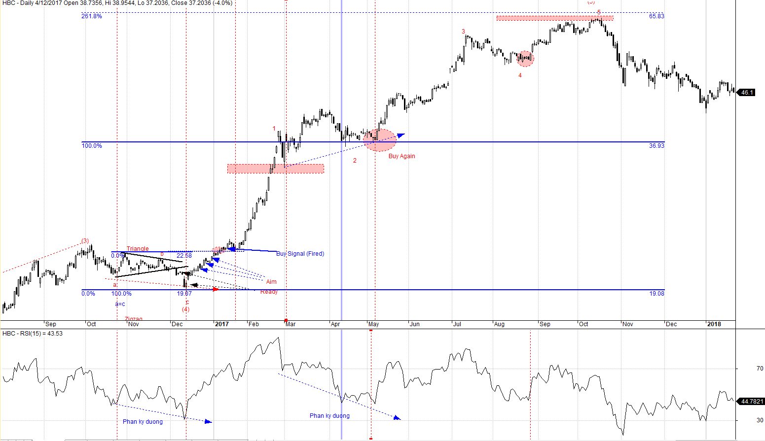 Tín hiệu phổ biến nhất là khi giá và RSI có phân kỳ dương. Tín hiệu mua của HBC vào tháng 5/2017 có phân kỳ dương.