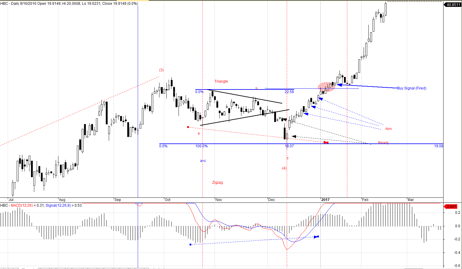 Mẫu hình Hook của MACD là khi đường MACD chạm vào đường Tín Hiệu và nảy lên. Thông thường, đây chính là các đọt điều chỉnh ngắn hạn trong xu hướng tăng. Hình dưới tôi minh họa cho cổ phiếu HBC vào đầu năm 2017, thời điểm tôi quyết định mua vào HBC sau khi nhận diện ra mẫu hình sóng Zigzag. Hook là cách đi theo sau xu hướng rất tuyệt vời nhất là khi thị trường xuất hiện xuất xu hướng.