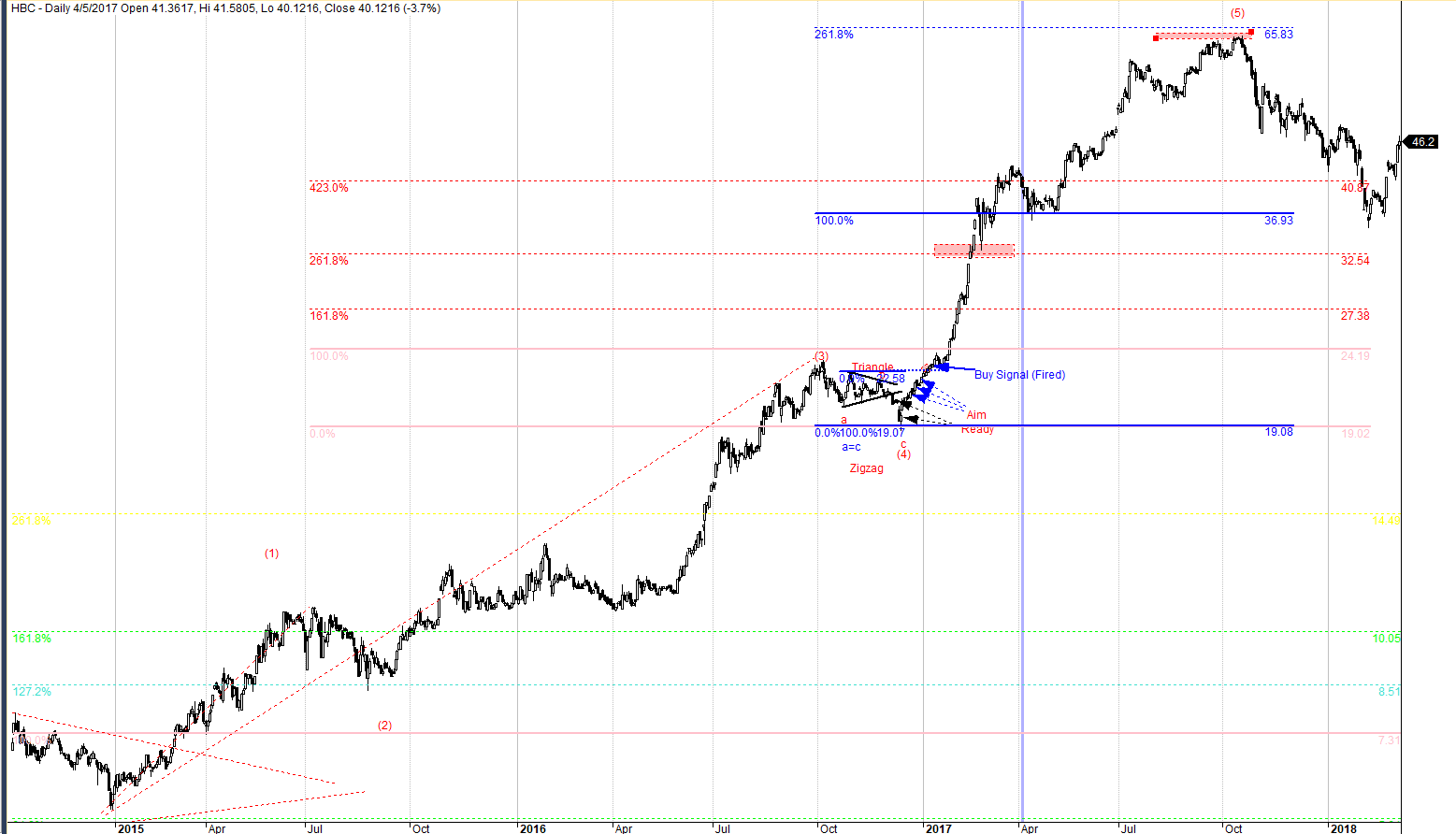 Nếu giá vượt qua tỷ lệ 2.618 kỳ vọng sóng (5) mở rộng. Lúc này cách tính mục tiêu giá phù hợp sẽ là 1.618 lần hoặc 2.618 lần chiều dài sóng (1)-(3) (từ điểm bắt đầu sóng (1) đến điểm kết thúc sóng (3)). Đồ thị dưới cho thấy, HBC đã dừng lại ở tỷ lệ 2.618 lần sóng (1)-(3) tại mức giá 65.8.