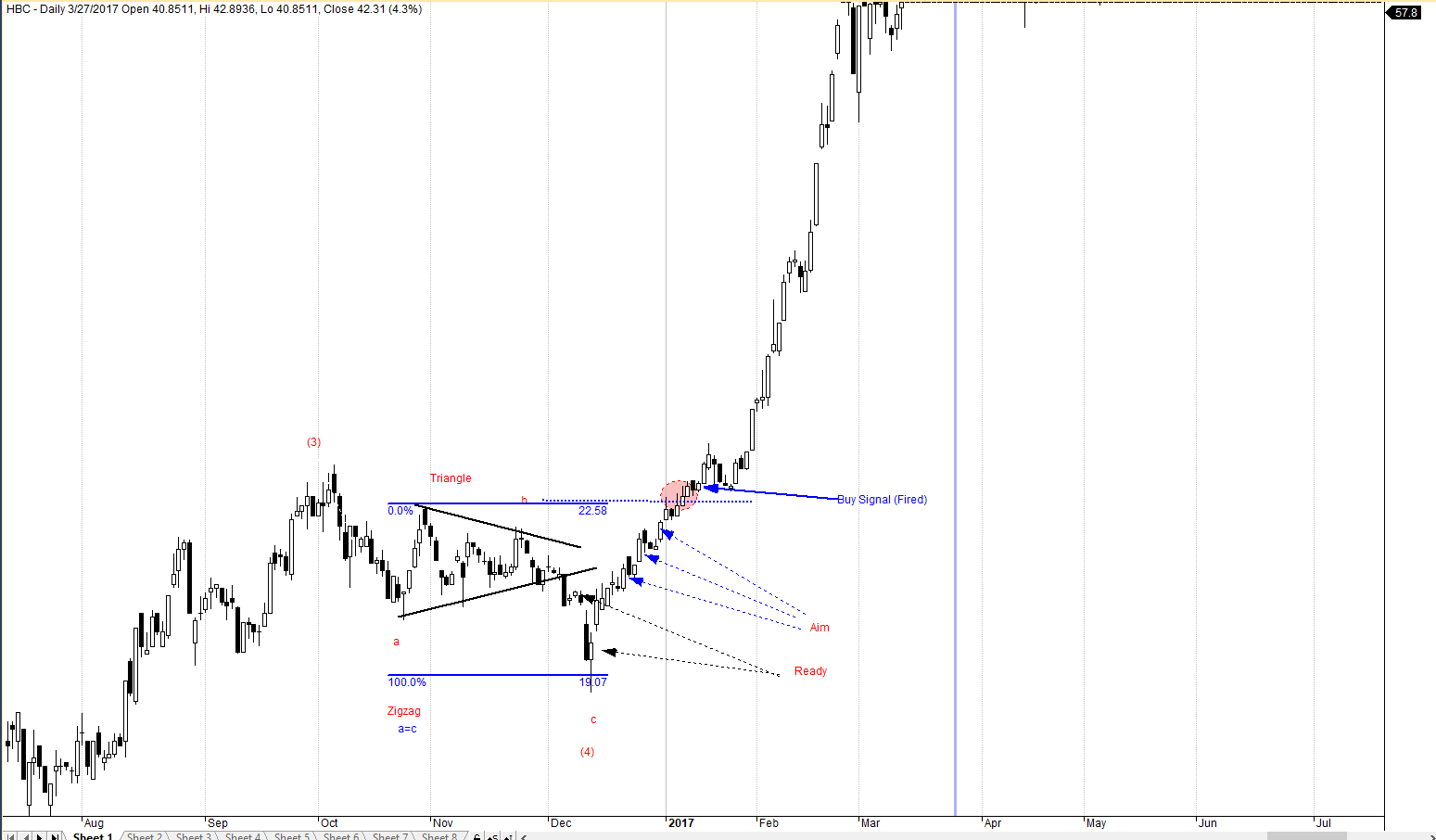 Liệu tôi có nên vội vàng giao dịch sau khi giá chạm mức 19 không. Câu trả lời là tùy thuộc vào định nghĩa giao dịch của bạn. Việc thiết lập tín hiệu giao dịch tùy thuộc vào khẩu vị rủi ro (ưa thích hoặc e ngại) nhưng nó cần phải được định nghĩa rõ ràng. Đối với Jeffrey, trong phương pháp giao dịch thân trọng, chúng ta chỉ thực hiện khi giá vượt qua đỉnh sóng b, tức 22.58. Khi giá nằm dưới mức giá này, tôi chỉ quan sát (ngắm-aim) mà thôi. Trước đó, khi giá nảy lên từ mức giá 19, tôi đang ở vào vị trí sẵn sàng (Ready)…