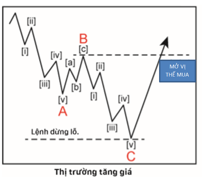 Tiếp theo, bạn phải kiên nhẫn, khi thị trường vượt qua đỉnh sóng [iv] trước đó trong sóng C, bạn chỉ ở vị thế sẵn sàng cho giao dịch. Bạn ngắm nghĩa giao dịch này nhưng không hề giao dịch. Chỉ đến khi giá vượt đỉnh sóng B theo đúng quy tắc, bạn MỞ VỊ THẾ MUA (BẮN)