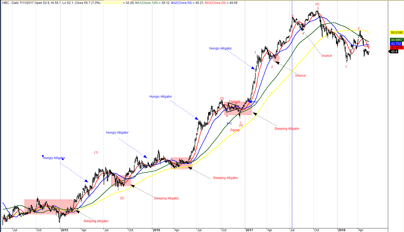 Một trong những nhược điểm của hệ thống Alligator là chỉ bắt được các xu hướng trong từng đoạn nhỏ vì sử dụng các đường trung bình di động ngắn hạn. Tôi đã cải tiến hệ thống Alligtor bằng cách sử dụng các đường trung bình di động dài hạn hơn. Hình dưới là áp dụng cho cổ phiếu HBC. Chúng ta nhận thấy rằng, tại các giai đoạn đường trung bình di động xoắn vào nhau, đó là giai đoạn thị trường không có xu hướng hay gọi là Cá Sấu Ngủ. Khi các đường trung bình di động bung ra và xếp trật tự, thị trường có xu hướng.