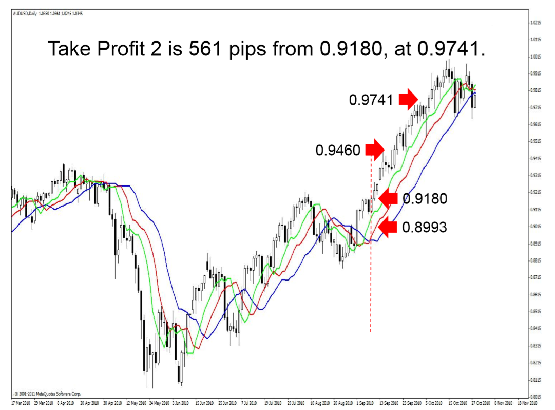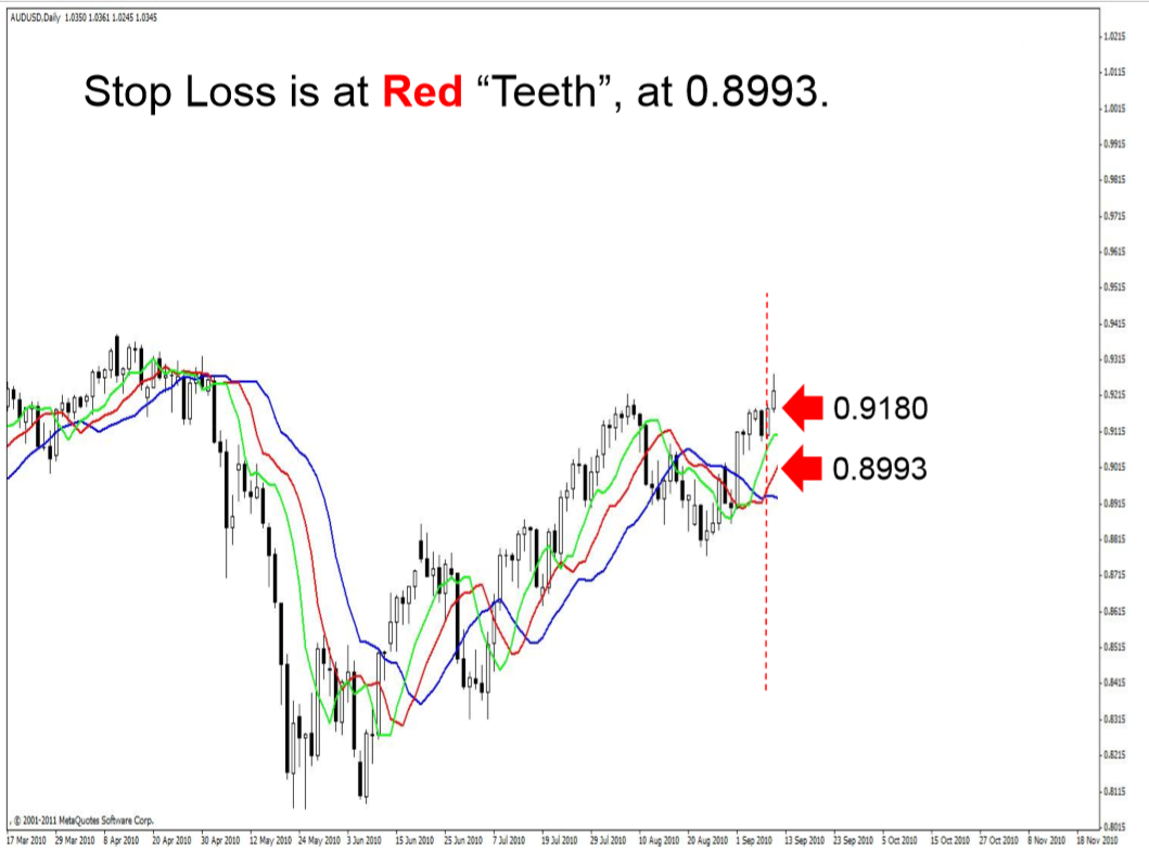 Ví dụ:vào tháng 9/2010, chúng ta có trật tự Môi (Green)> Răng (Red) > Hàm (Blue) và tín hiệu mua xuất hiện. Chúng ta mua tại mức giá 0.9180, là cây nên tiếp theo sau khi xuất hiện trật tự này. Stoploss đặt tại 0.8993, ngay dưới Răng (khoảng cách 187 pip).