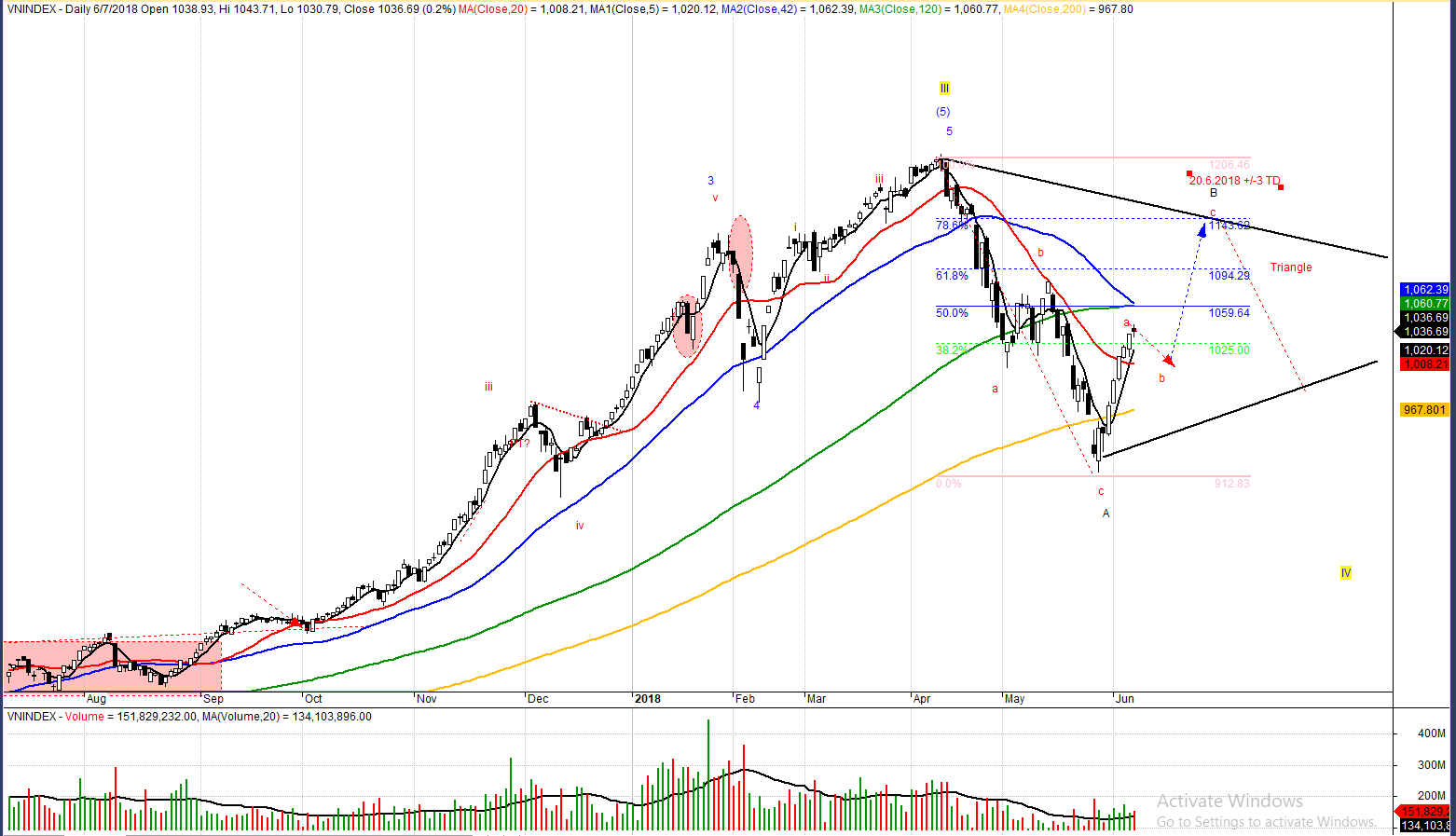 Đợt giảm từ ngày 10/4/2018 đến 28/5/2018 diễn ra theo ba sóng a-b-c và được hỗ trợ bởi đường MA 200 ngày. Mức giảm này tuy khá lớn nhưng nếu xem xét trong toàn bộ pha tăng giá từ năm 2012 đến nay, mức độ điều chỉnh vẫn chưa vượt qua tỷ lệ Fibonacci 38.2%. Do đó, kịch bản sóng hiệu chỉnh cho sóng IV mà chỉ số VN-Index diễn ra có thể là dạng Tam Giác (Triangle), Phẳng (Flat), hoặc thậm chí là bất bình thường (Irregular). [Trader vui lòng xem định nghĩa về các cấu trúc sóng hiệu chỉnh trong cuốn sách ‘HƯỚNG DẪN GIAO DỊCH THEO SÓNG ELLIOTT”]