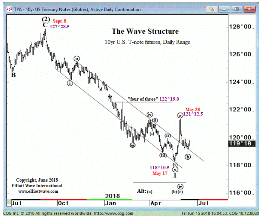 Sau khi Fed tăng lãi suất thêm 0.25%, đưa lãi suất mục tiêu lên 1.75%-2%. Mặc dù phản ứng của thị trường là không mạnh sau khi Fed tăng lãi suất, nhưng trên biểu đồ giá T-Note kỳ hạn 10 năm, tôi đang nhìn thấy kịch bản sóng c (vòng tròn) sẽ tăng.