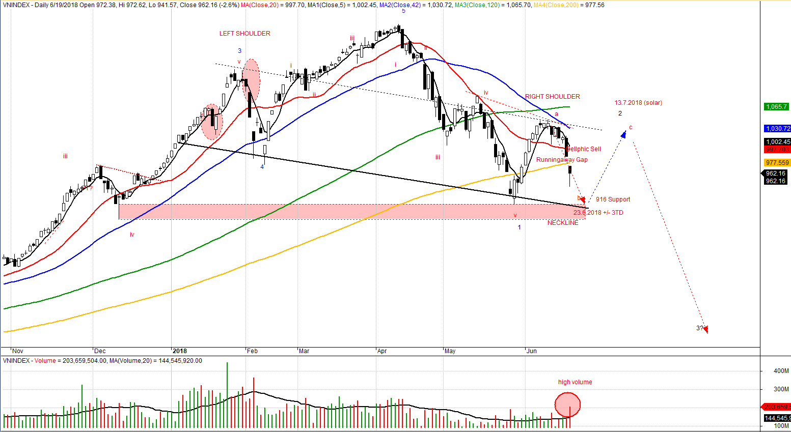 Đà giảm của VN-Index có thể còn kéo dài 1-2 phiên tới. Trong đồ thị ở hình dưới, tôi đánh dấu khoảng trống là Runningaway Gap. Nhưng nó là Runningaway Gap hay Exhaustion Gap phải chờ 3-4 phiên tới để xem khoảng trống có bị lấp hay không. Exhaustion Gap sẽ nhanh chóng bị lấp còn Running away Gap thì không. Trong khi đó, đáy 916 cũng là một mức hỗ trợ tốt. Chúng ta thấy có đường kênh giá song song màu đen đang tồn tại.