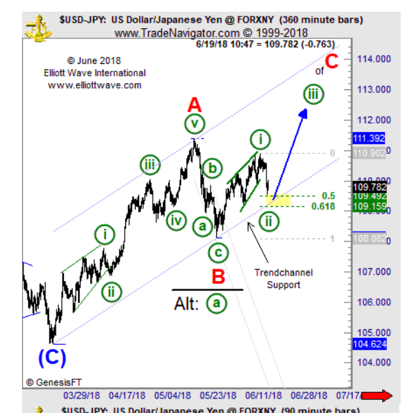 Cặp tỷ giá USD/JPY cũng được kỳ vọng tạo đáy và tăng. Trên đồ thị sóng ELliott, USD/JPY đang kỳ vọng tạo đáy sóng ii (vòng tròn) và chuyển sang sóng iii (vòng tròn)