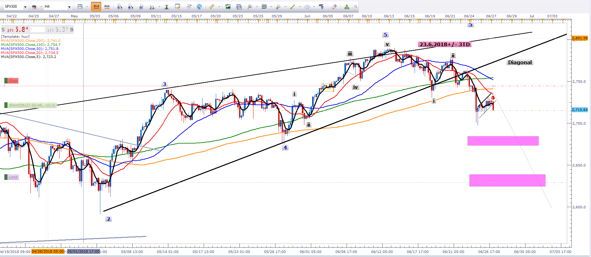 Một bức tranh hay đáng giá hơn vạn lời nó. Trên đồ thị H4, chỉ số SP500 xuất hiện sóng chéo (Diagonal). Gần nhất, chỉ số SP500 còn xuất hiện sóng zigzag trong kênh giá song sóng. Tôi quyết định bán khống chỉ số SP500 dựa trên “HƯỚNG DẪN GIAO DỊCH THEO SÓNG ELLIOTT”