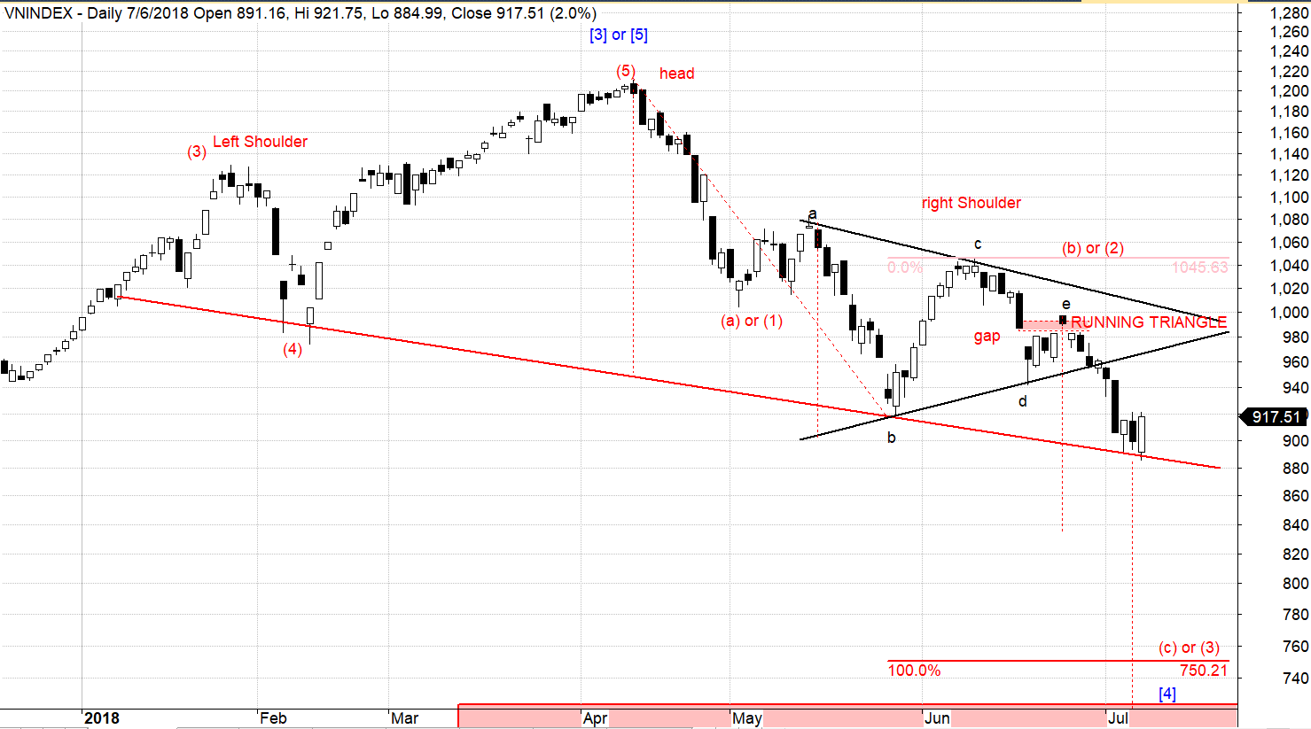 Trên đồ thị của VN-Index, tôi nhìn thấy sự xuất hiện của mẫu hình “Running Triangle” (Tam Giác Liên Tục). Điểm bán khống tôi bắt đầu thực hiện là 940 điểm, tức ngay sau khi phá thủng đáy sóng “d”. Để xác định mục tiêu giá của mẫu hình sóng tam giác, vui lòng xem thêm hướng dẫn tại Chương 3 cuốn sách “HƯỚNG DẪN GIAO DỊCH THEO SÓNG ELLIOTT”.