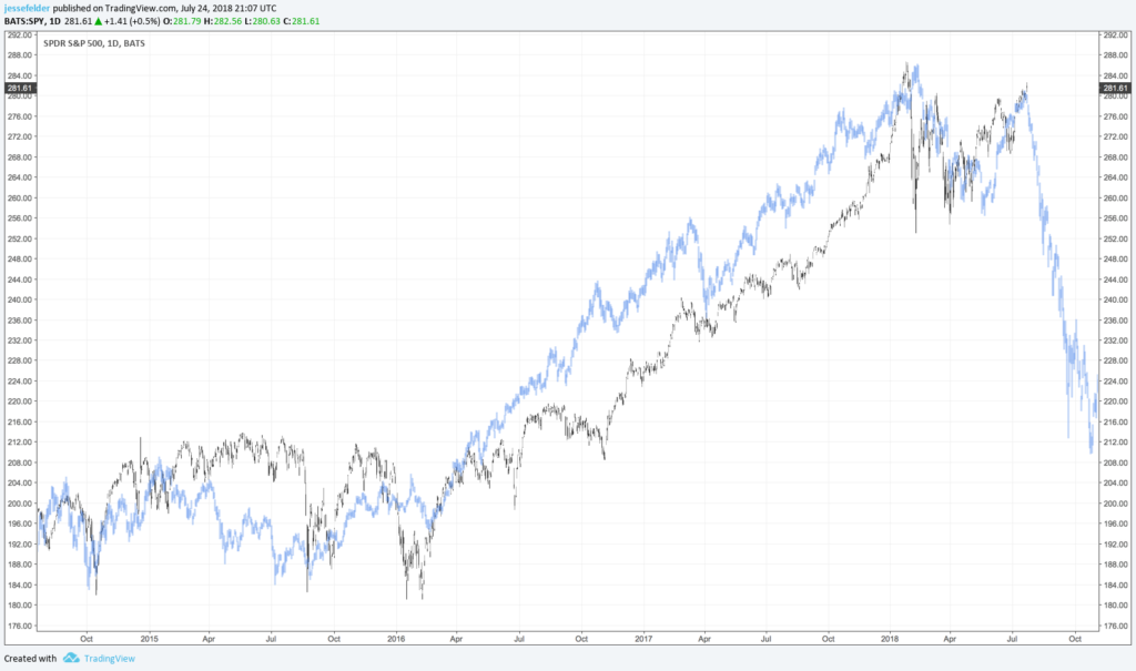 Không chỉ giống nhau về yếu tố cơ bản, chỉ số S&P500 (màu đen) sau 4 năm tăng giá đang giống hệt năm 1937 (màu xanh). Sau đây là đồ thị của năm 1937.